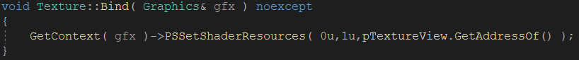이렇게 구성한 Texture와 Sampler는 결국 Bind를 호출하여 파이프 라인에 정보를 넘겨주도록 합니다. 그런데 아래의 두 Bind 함수를 보면 첫 번째 Argument가 0으로 일치한다는 것을 알 수 있습니다. 이 Start Slot은 Shader나 레지스터 측에서 직접적으로 접근하는 번호와 같기 때문에 둘은 같아야만 합니다.