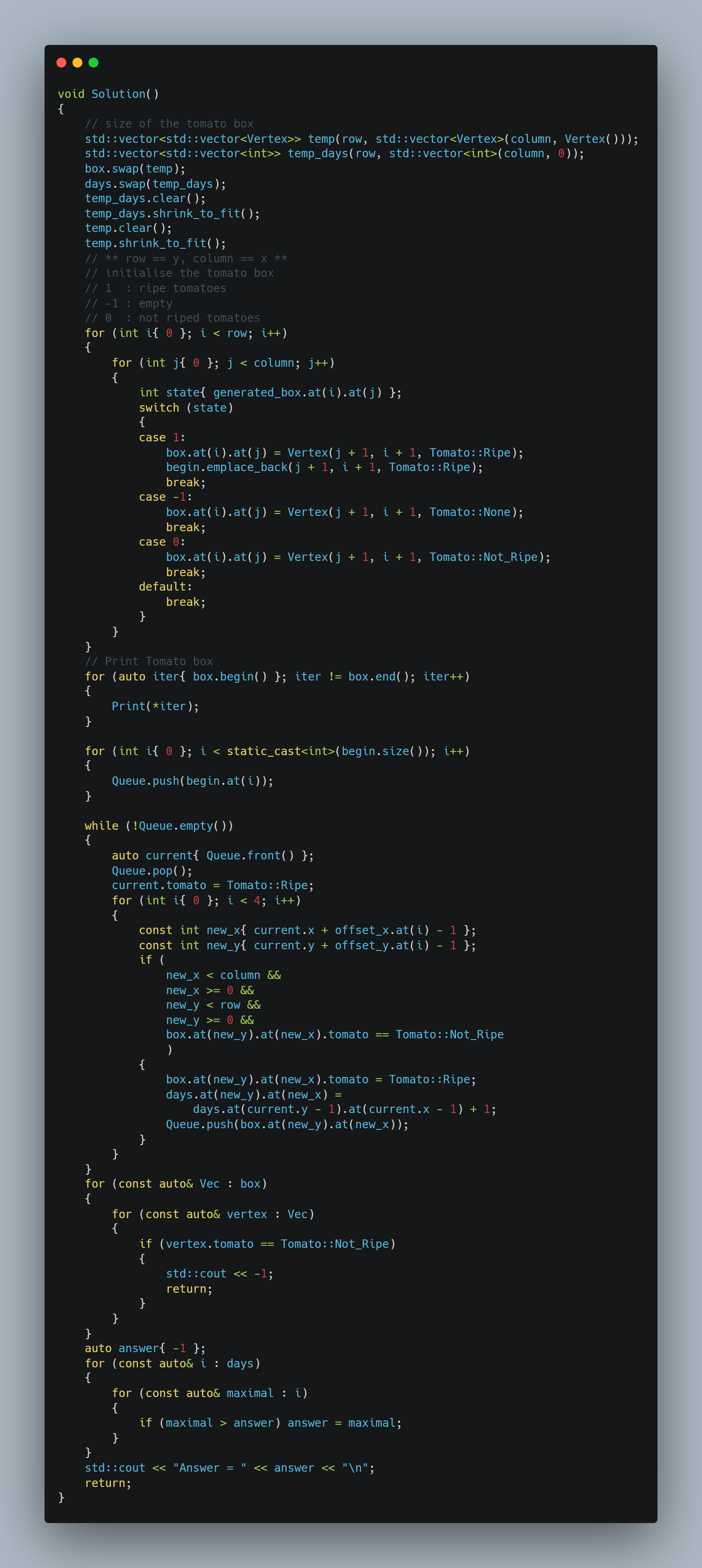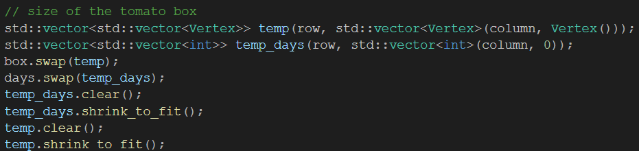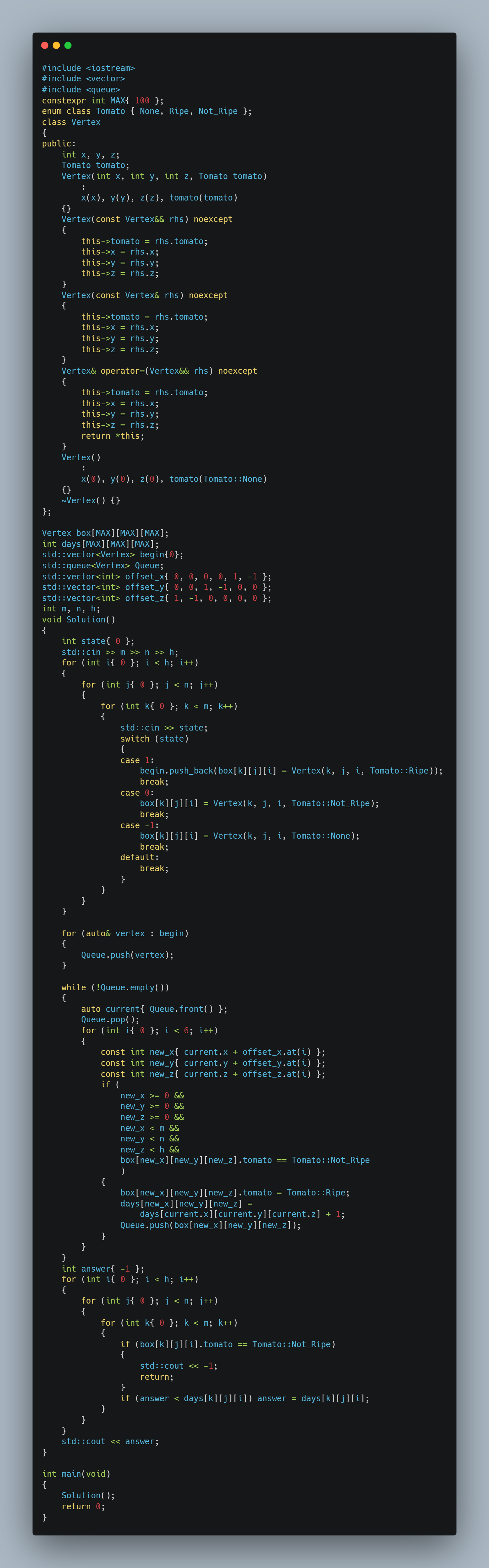 figure 4d-1 Solution에 진입하면 가장 먼저 사용할 정보들을 정리합니다. 안 해도 되는데 한 번 정리를 해보았습니다. 실질적으로 어떤 효용이 있을지 모르겠습니다. 대신 Iterator을 사용하여 정보를 출력할 때 깔끔하게 인쇄된다는 장점이 있습니다. 제가 생성한 임의의 토마토 상자들을 Vertex로 변환하여 격납할 컨테이너 box, 경과한 날짜를 기록할 days를 입력된 컨테이너에 알맞게 조정합니다.