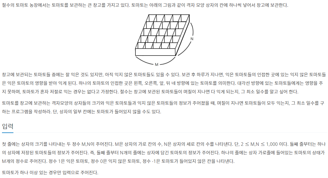 figure 1b 첫 줄에 상자의 크기가 결정됩니다. 그리고 두 번째 줄부터는 상자에 저장된 토마토의 정보들이 정수의 형태로 하나씩 주어집니다.