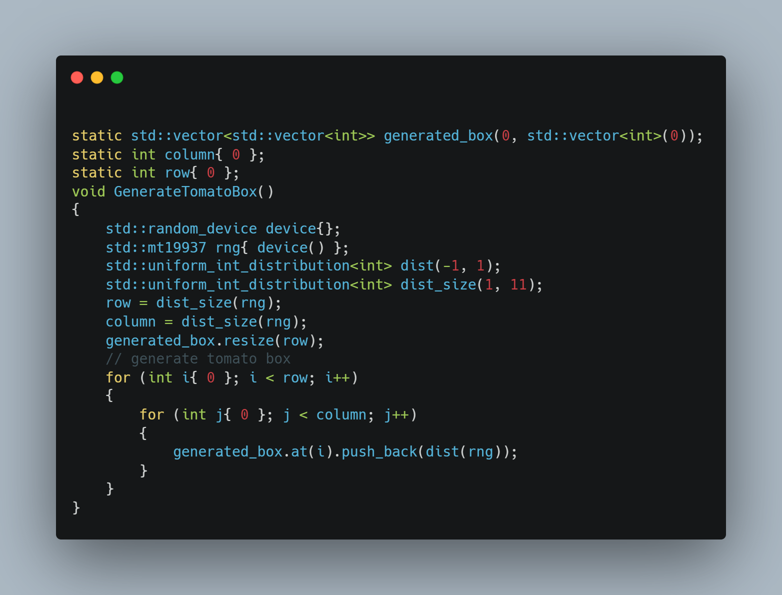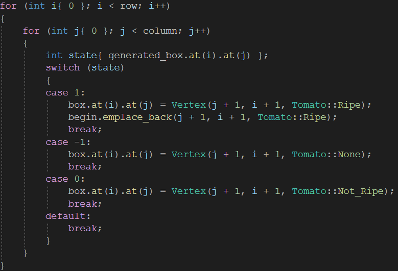 figure 2a Enumeration class을 도입하여 문제를 풀 때 헷갈리지 않도록 했습니다. 익은 토마도는 Ripe, 익지 않았으면 Not_Ripe, 토마토가 없거나 기타 다른 상황엔 None을 부여할 것입니다. Vertex Class의 세세한 부분은 알고리즘 보다는 C++의 다른 문서들을 참조하는 편이 나을 것 같습니다. rvalue/lvalue referenece, function overloading, std::move등의 C++ 지식이 조금 있으면 좋습니다. 가장 중요한, 무조건 있어야 하는 것은 Vertex의 좌표인 x, y그리고 Vertex 자리에 존재하는 토마토의 상태를 나타내는 tomato입니다. 그리고 7576번 문제를 흉내 내기 위해서 다음과 같은 무작위 토마토 상자 생성 함수를 만들었습니다.