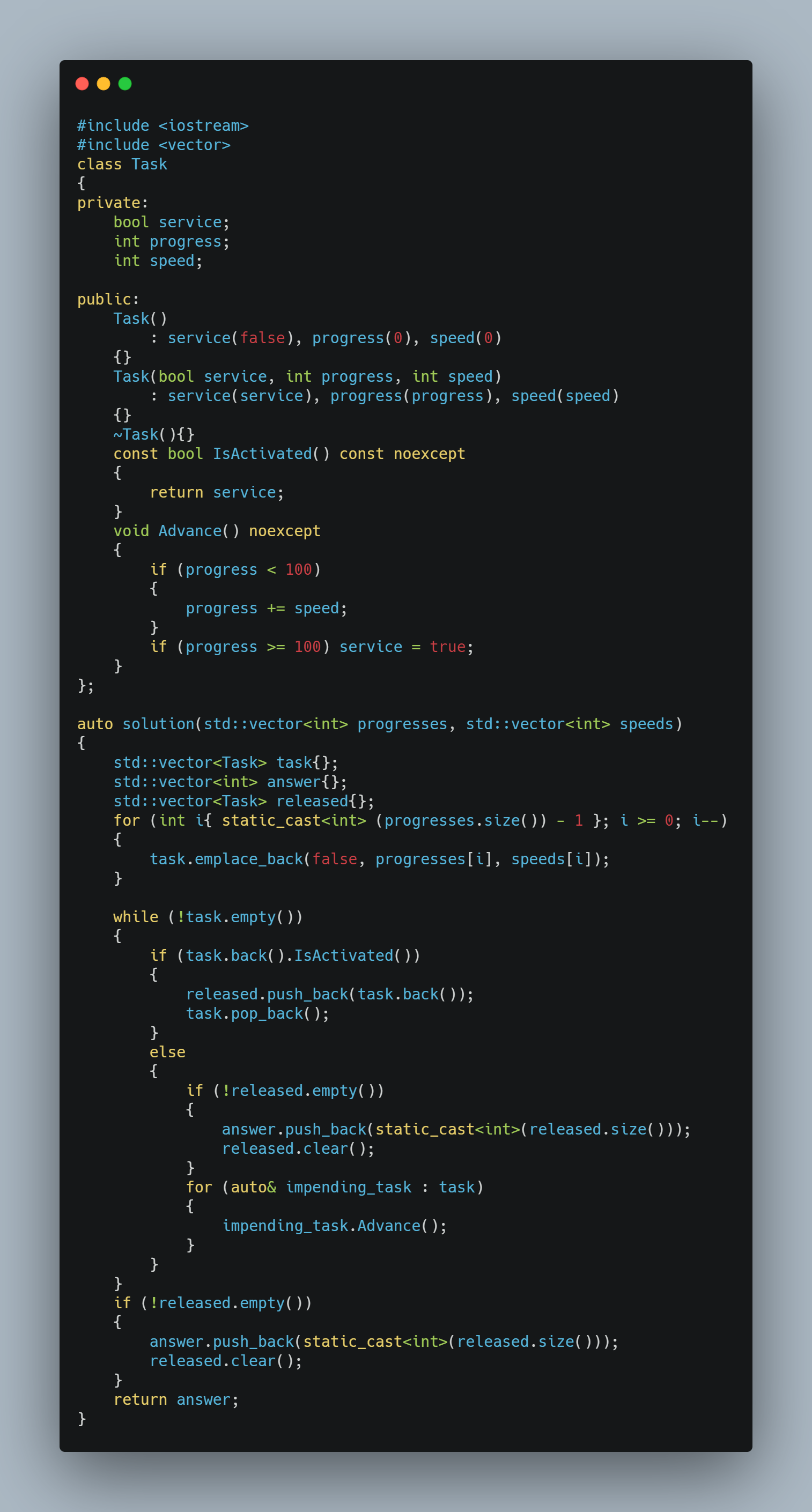 더 나은 방법이 있습니다. 저처럼 For Loop한 번을 하루로 계산하지 말고 ( 100 - 현재 진척도[i] ) / 하루 작업 진척도[i]을 하면 어떤 작업 N이 완성되는데 걸리는 남은 시간을 구할 수 있습니다. 작업 완성도가 100을 넘어야 출시가 되기 때문에 차라리 ( 100 - 현재직척도[i] ) % 하루 작업 진척도[i]로 쓰고 나머지가 있는가 없는가 나누어서 계산해도 될 것 같습니다.