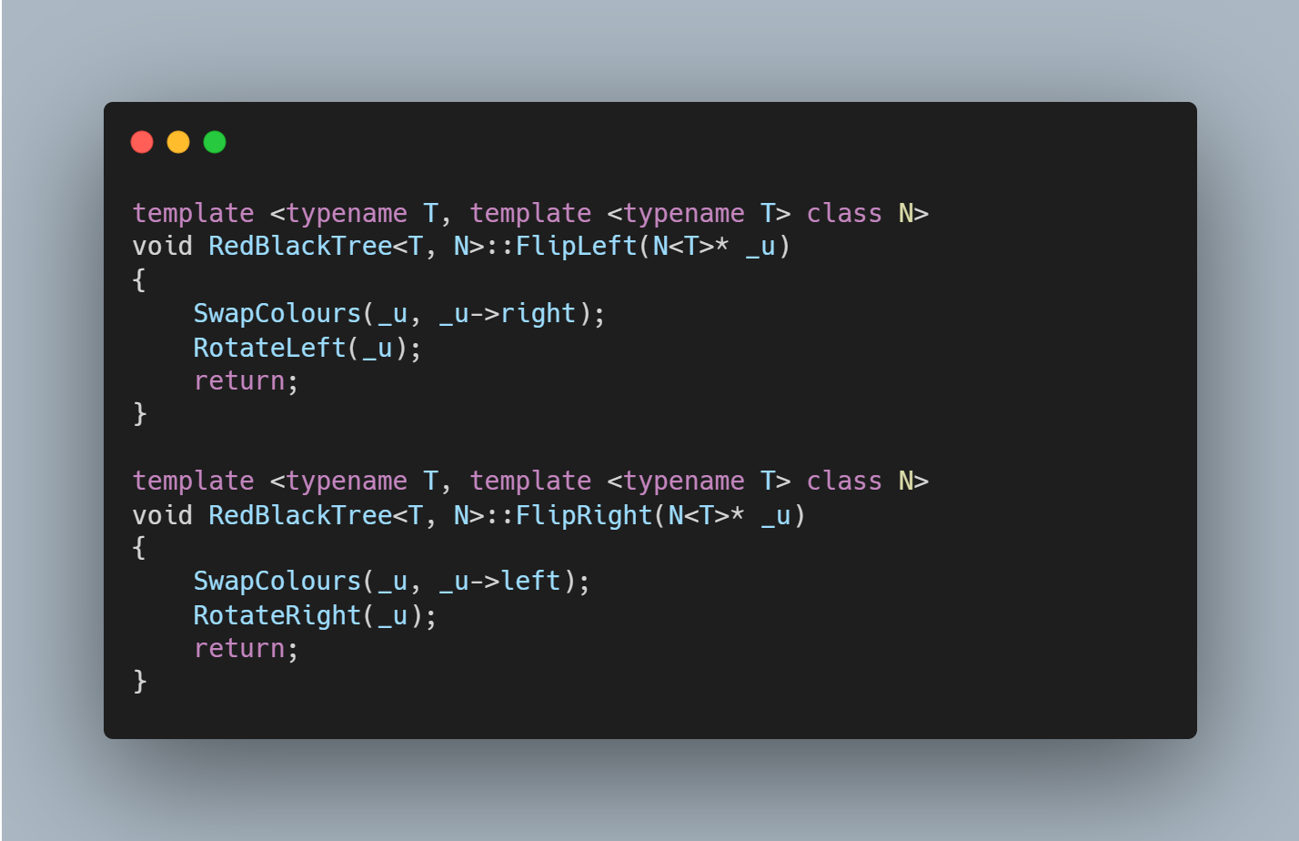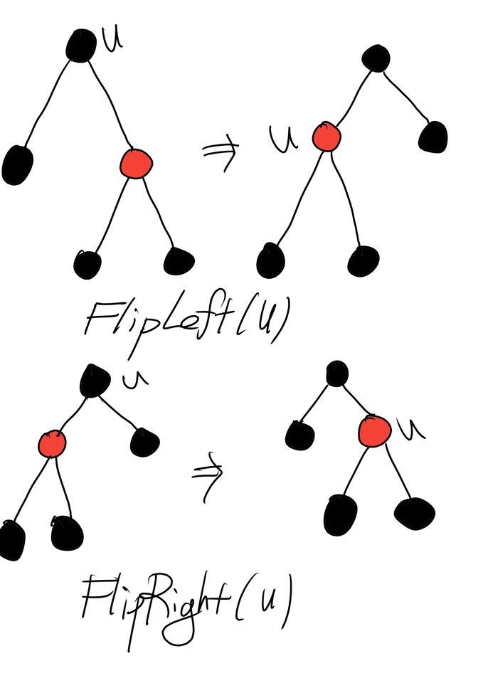 Figure f 상당히 직관적으로 작성된 FlipLeft의 경우엔 u와 u.right의 색을 서로 바꾸고 Treap에서 소개된 Rotation을 통해 좌측으로 회전시킵니다. 따라서 이 함수는 두 node의 색을 바꿀 뿐만이 아니라 Child-Parent의 관계까지 바꾸게 된다는 뜻입니다. 특히, FlipLeft는 Left-Leaning property를 위반하는 node u를 복구하는데 상당히 유용하게 작용합니다. 따라서 이 함수가 수행된특별한 경우에 한해서는 Black-Height, No-Red-Edge의 성질을 위반할 수 없다는 사실을 확인할 수 있습니다. FlipRight는 FlipLeft의 대칭적인 함수의 역할을 수행하기 때문에 특별히 살펴볼 만한 것은 없습니다.