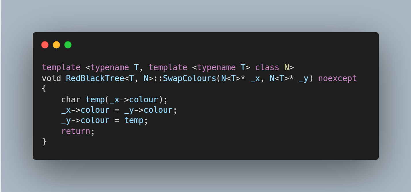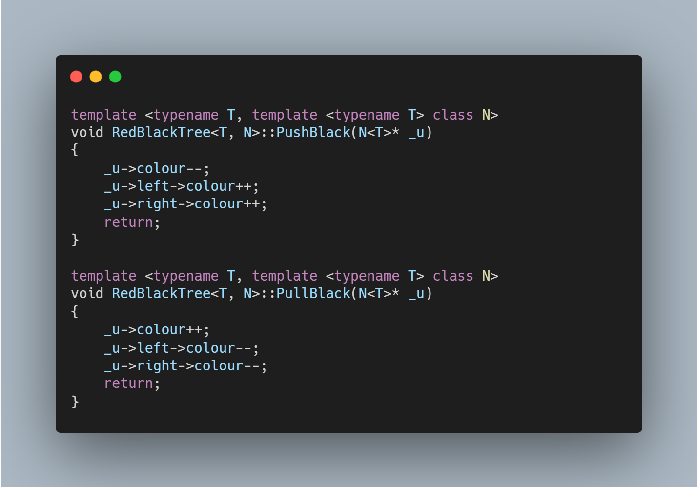 Figure b.2 Figure b.1는 Black Height Property를 유지하며 색깔을 조정합니다. PushBlack(u)는 두 개의 Red Node를 가진 Black node를 Parameter로 node u를 취합니다. 받은 black node u를 Red로, u가 가진 Red Children을 Black으로 칠합니다. PullBlack(u)는 PushBlack(u)의 정반대의 기능을 수행합니다. SwapColours라는 추가적인 함수를 만들어 두 개의 서로 다른 node의 색을 바꿔주는 간단한 함수를 구현해야 합니다.
