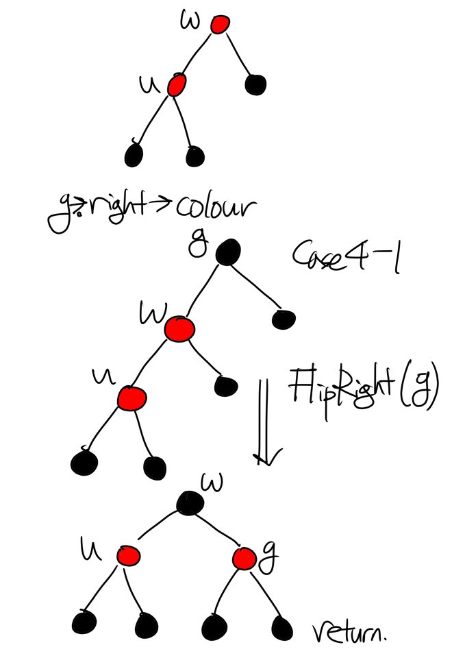 마지막 Case 4-2-b입니다. w가 g의 Right subtree일 경우인데 사실은 Case 4-2-a와 크게 다른 것이 없습니다. 그림에 표기하는 것을 깜빡했는데 이 과정이 마무리되고 u=g로 놓고 다시 이 작업을 수행해야만 하는데, 그 이유는 Black에서 Red로 바뀐 g가 g->parent에 대해 다시 No-Red-Edge를 위반할 가능성이 존재하기 때문입니다. 따라서 Case 4-2-a가 반쯤 완료되었다 표현한 것입니다!