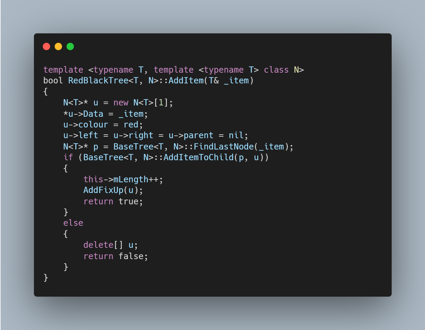 RBT에서 Addition을 내장하기 위해서는 가장 먼저 일반적인 Binary Search Tree에서 수행했던 새로운 Leaf node를 추가하는 방식을 채택할 것입니다. 즉 새로운 node u에 데이터 x를 저장하고 Red라는 성질을 추가로 제공하는 것입니다. 하지만 이 글에서 사용하는 방법은 저장할 데이터를 받아 내부에서 Node를 생성하여 추가하기 때문에 BinarySearchTree에서 사용했던 Rotation, Add은 그대로 쓰기가 어렵습니다(Node의 Type이 다르기 때문입니다). 따라서, Code duplication에 가까운 짓을 해야만 합니다. 다채로운 해결방법이 있으나 무시하고 진행합니다.