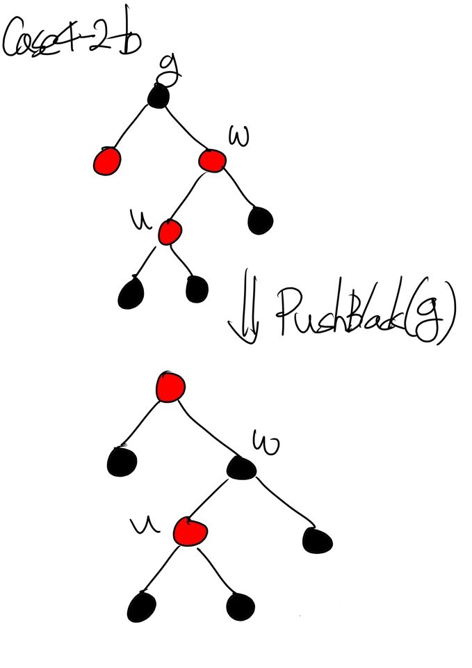 Case 4-2의 경우엔 또 다시 a,b 두 가지의 상황을 상정해야 한다. Case 4-2-a의 경우는 node w가 g의 left subtree일 경우입니다. g->right의 node를 uncle이라고 했을 때, uncle node의 각 children node는 black node일 것이 RBT의 세 가지 성질에 의해 자명합니다. Uncle도 나오고 더 난리가 났습니다! 따라서, RBT의 세 가지 성질을 만족하는 임의의 Red Node를 Black Node로 바꾸었을 경우에 어떤 위반도 일어나지 않는다는 점을 바탕으로 node g에 대해 PushBlack을 수행하면 Case 4-2-a의 경우 작업을 반쯤 완료시킬 수 있습니다. node g는 black이라는 점은 현재 No-Red-Edge의 위반을 유발한 Node가 w가 아닌 u라는 점에서 자명합니다. w는 RBT의 모든 Properties를 만족하고 있었기 때문에 Node g는 반드시 Black일 수밖에 없습니다.