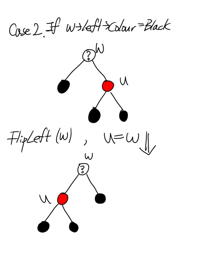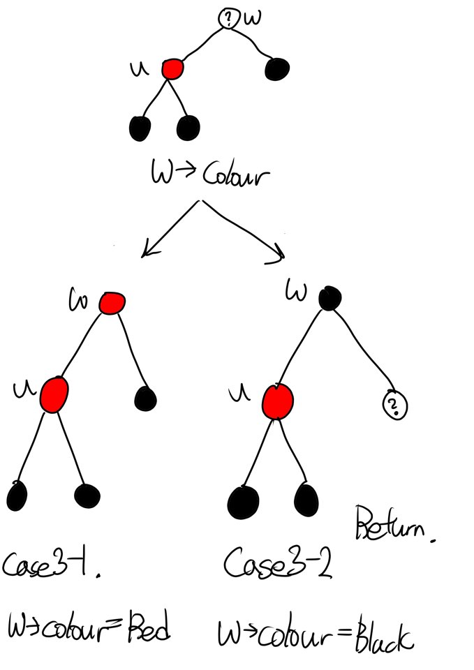 마지막으로 u=w는 Rotation의 영향으로 뒤바뀐 w와u를 부모-자식 관계를 다시 복원시키는 역할을 합니다. 더 자세히 설명하자면 Case 2를 Case 1-2와 완전히 같은 생태를 만들어 FixAddUp을 수행하겠다는 뜻입니다. 이렇게 가공된 Case 2의 결과를 보면 Case 1-2와 똑같다는 것을 알 수 있습니다. 물론 parent node w의 색은 다를 수 있습니다. Case 2에서 w가 Black이었다면 Case 1-2와 완전히 같은 결과일 테지만 w가 Red인 상태였다면 다른 모습으로 작업이 끝났을 것입니다. 다음을 더 살펴보도록 합니다. 바로 이 내용이 나옵니다. w의 colour에 따라 두 가지의 경우로 갈라집니다.