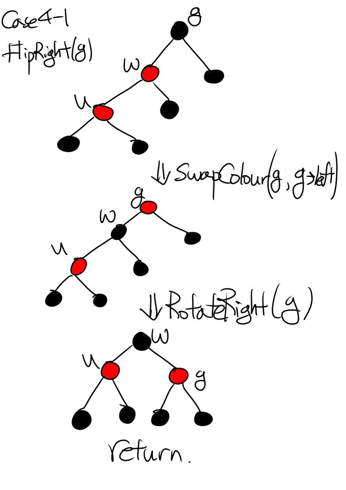 마지막 Case 4-2-b입니다. w가 g의 Right subtree일 경우인데 사실은 Case 4-2-a와 크게 다른 것이 없습니다. 그림에 표기하는 것을 깜빡했는데 이 과정이 마무리되고 u=g로 놓고 다시 이 작업을 수행해야만 하는데, 그 이유는 Black에서 Red로 바뀐 g가 g->parent에 대해 다시 No-Red-Edge를 위반할 가능성이 존재하기 때문입니다. 따라서 Case 4-2-a가 반쯤 완료되었다 표현한 것입니다!