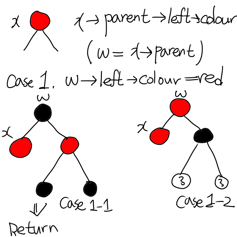 Case 1-1은 Parent node w가 black이기 때문에 No-Red-Edge 성질을 위반하지 않습니다. 따라서 그대로 Return하여 FixAddUp을 끝냅니다. w의 right child가 black인 경우를 떠올릴 수 있는데 Add가 수행되기 전에 RBT의 모든 성질을 만족하고 있었더라면 해당 자리에 Black이 있을 경우, 새로운 node가 x자리에 추가될 수 없습니다.