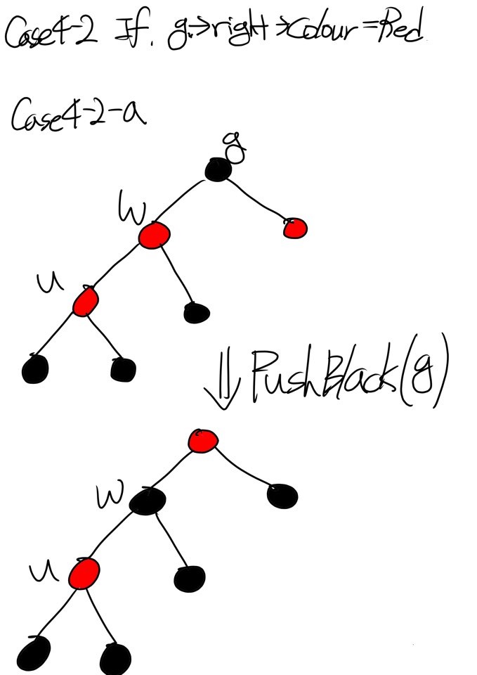Case 4-2의 경우엔 또 다시 a,b 두 가지의 상황을 상정해야 한다. Case 4-2-a의 경우는 node w가 g의 left subtree일 경우입니다. g->right의 node를 uncle이라고 했을 때, uncle node의 각 children node는 black node일 것이 RBT의 세 가지 성질에 의해 자명합니다. Uncle도 나오고 더 난리가 났습니다! 따라서, RBT의 세 가지 성질을 만족하는 임의의 Red Node를 Black Node로 바꾸었을 경우에 어떤 위반도 일어나지 않는다는 점을 바탕으로 node g에 대해 PushBlack을 수행하면 Case 4-2-a의 경우 작업을 반쯤 완료시킬 수 있습니다. node g는 black이라는 점은 현재 No-Red-Edge의 위반을 유발한 Node가 w가 아닌 u라는 점에서 자명합니다. w는 RBT의 모든 Properties를 만족하고 있었기 때문에 Node g는 반드시 Black일 수밖에 없습니다.