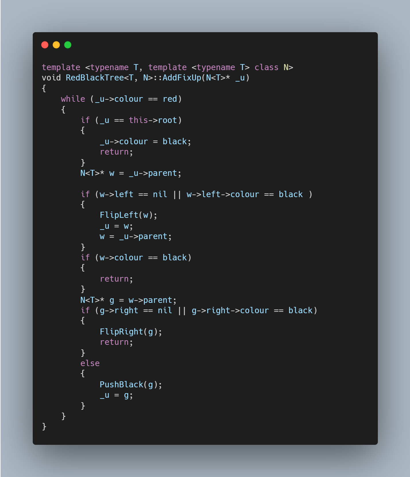 Node x는 추가하려는 node를 나타냅니다. 그리고 각 case 1-1과 case 1-2는 x의 parent의 left의 colour에 따라 경우를 나눈 것입니다. case 1-1과 case 1-2는 모두 x 자신이 x->parent의 Left Child인 경우를 나타냅니다. 한 가지 추가할 사항이 있는데 RBT의 특성 상 Leaf node는 null pointer로 취급하기는 하지만 사실 null pointer가 아닌 nullptr처럼 행동하는 Node pointer를 추가할 것입니다. 사실, 이 개념은 Binary Search Tree에서부터 사용했어야 할 개념이었기 때문에 다음과 같은 코드를 Binary Search Tree에 추가기로 합니다.