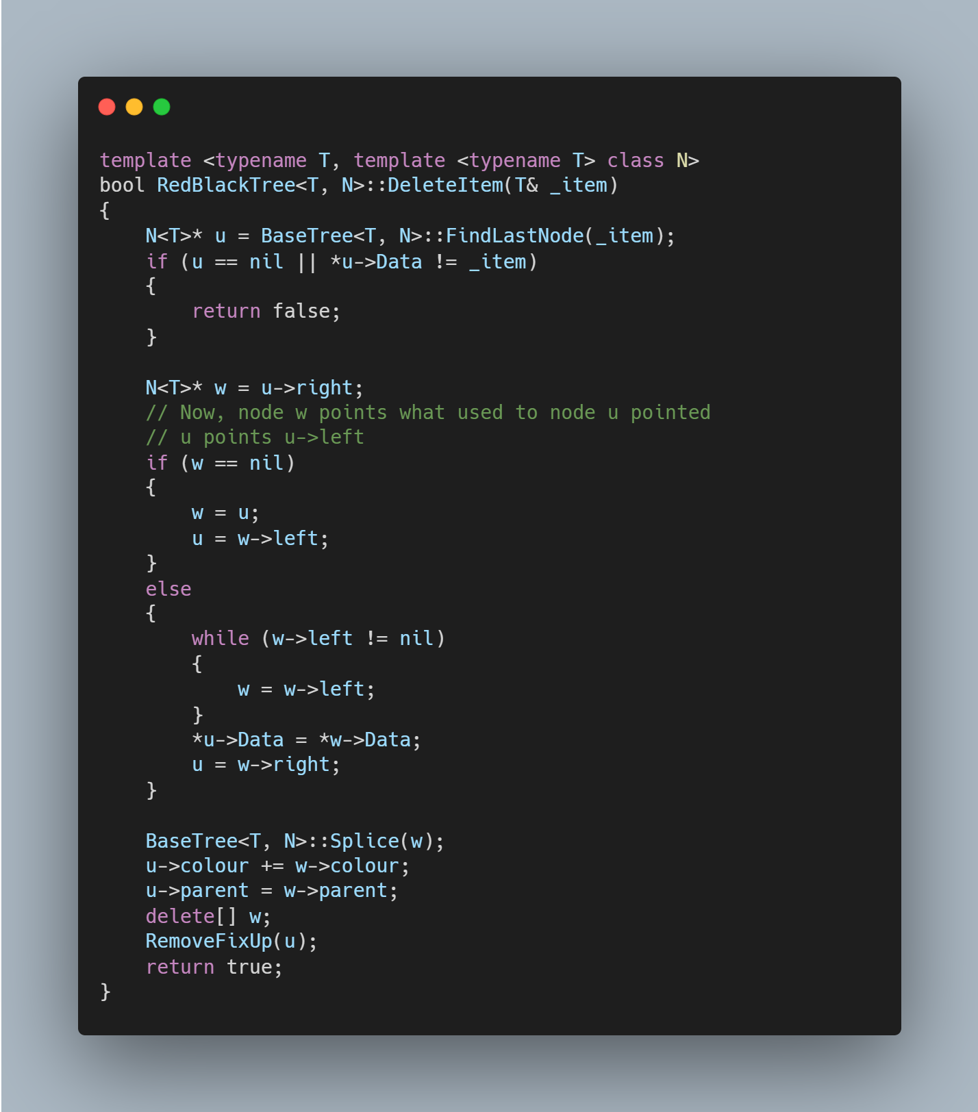 첫 번째 If statement은 삭제하려는 item이 없는 경우를 가리킵니다. FindLastNode는 _item을 Data로써 갖고 있는 Node를 Return하거나 _item이 존재하지 않으면 어떤 Leaf Node의 parent node를 Return합니다. 따라서 nil을 Return한 경우는 RBT자체가 아무런 정보를 갖고 있지 않은 상태이며 *u->Data != _item인 경우는 RBT내에 삭제할 Item이 존재하지 않는 경우입니다. 이 두 경우를 제외하면 u는 적어도 RBT내부에 존재하는 어떤 Node를 가리키게 됩니다.