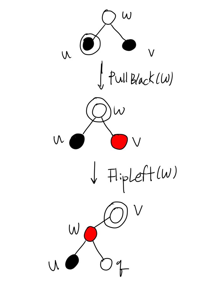 FlipLeft(w)를 수행하면 w는 Red가 됩니다(FlipLeft는 w와 Child node의 색을 교환하고 Rotate를 수행했음을 떠올리도록 합니다. 특히, 여기선 FlipLeft를 수행했으니 Right child인 v의 Red와 색이 바뀌었습니다. 추가로 현재 각 node u, w, v가 어떤 관계를 가지고 있는지를 명확히 파악하는 것이 좋습니다). 이제 node v는 u와 w를 포함하는 Subtree의 root가 되었습니다. 여기서 w가 No-Red-Edge를 위반하는지 어떤지를 판단할 것인데 이는 w의 right child q의 colour을 통해 판단할 것입니다. 만약 q가 black이라면 w는 No-Red-Edge를 위반하지 않는 것이고 Node pointer u를 Node pointer v를 가리키게 만들고 Iterator로써 Return하여 다시 RemoveFixUp을 수행합니다.