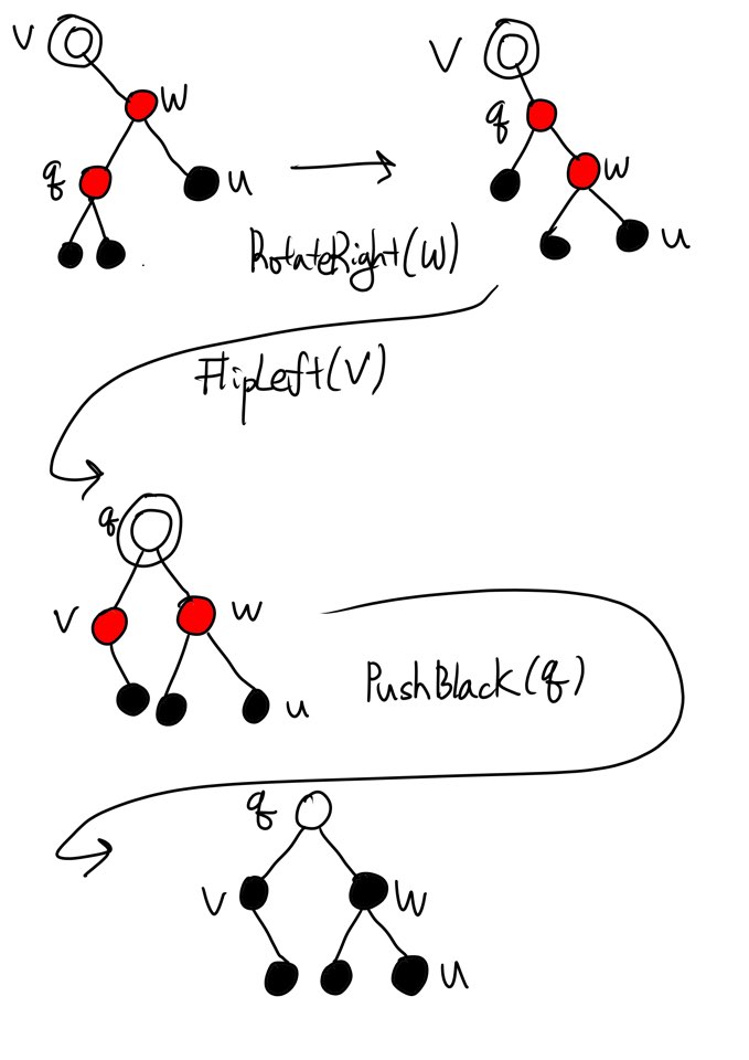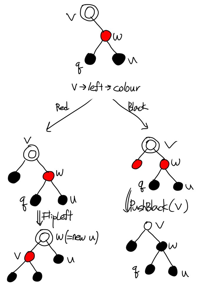 FlipRight(v)는 q를 v와 w의 Parent node로 만듭니다. 곧바로 PushBlack(q)을 호출하면 v와 w를 모두 Black으로 만들며 q를 원래 색으로 되돌려놓습니다. 놀랍게도 Double black은 사라졌고 No-Red-Edge와 Black-Height 두 성질 중 하나라도 위반하는 Node는 존재하지 않게 되었습니다. 여전히 한 가지의 문제가 여전히 남아있는데 v의 right child가 Red일 수 있으며 Left-Leaning 성질을 위반할 가능성이 존재한다는 사실입니다. 이 일말의 가능성까지 검토한 이후에 만약 필요하다면 FlipLeft(v)를 수행하고 나서야 마침내 다음 작업으로 넘길 수 있습니다.