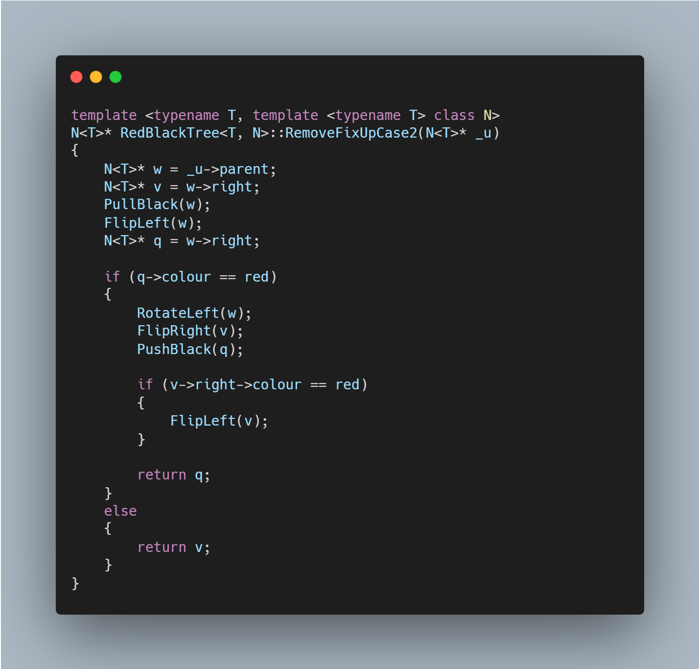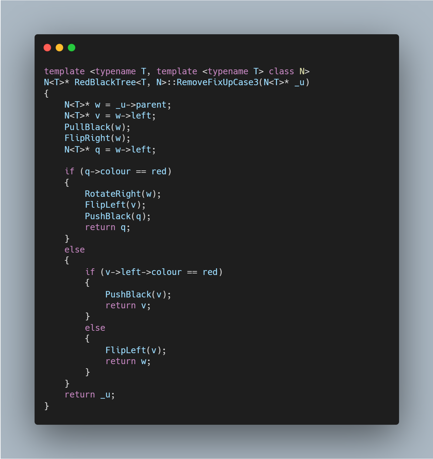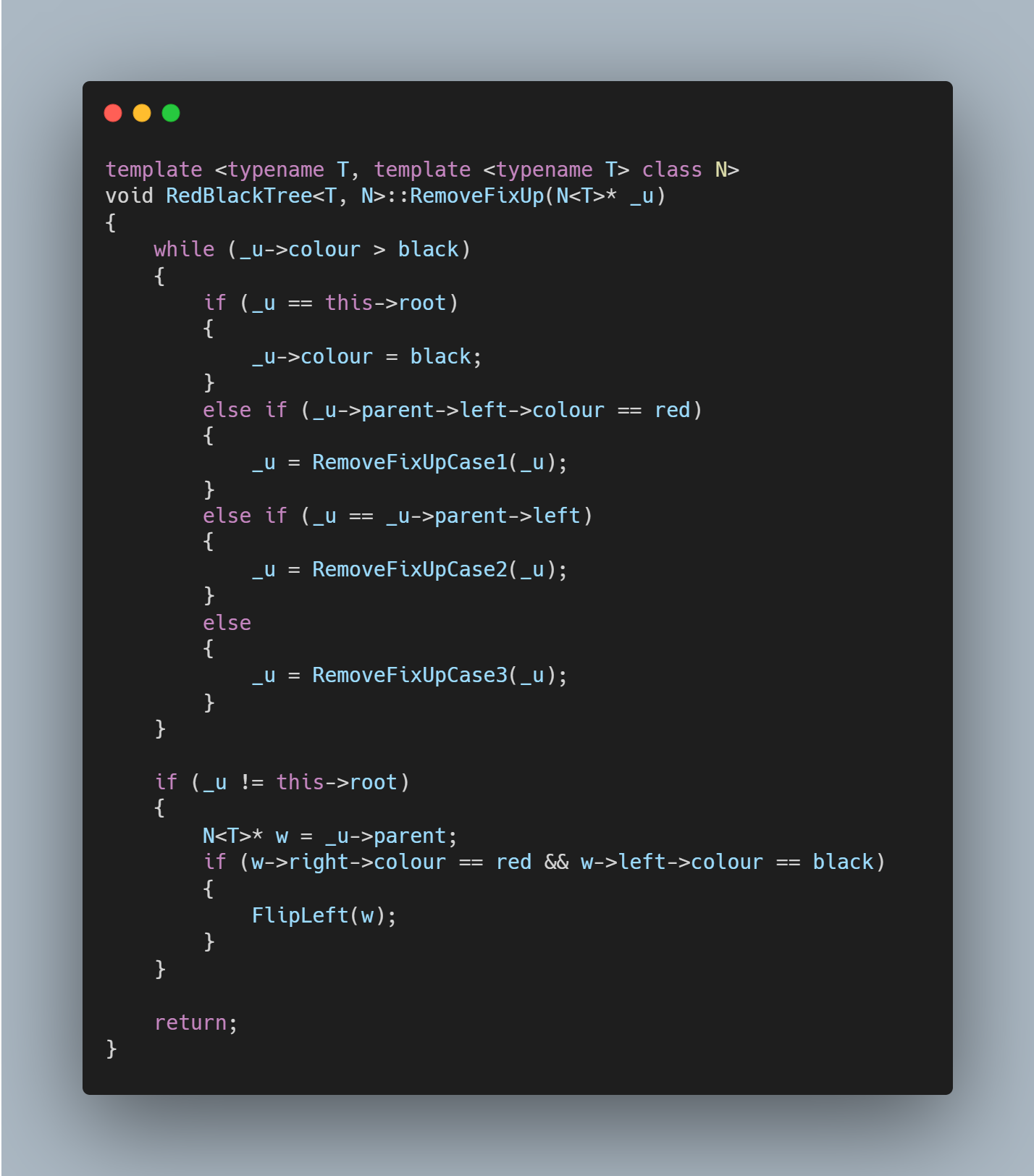 이 If statement가 끝난 시점에서 node w가 잡고 있는 것은 삭제할 Data를 갖고 있는 Node입니다. 따라서, node w를 Splice함으로써 Node w를 떼어내고 w의 colour를 u에 합쳐줌으로써 위에서 말했던 미봉책 상태를 갖춘 것입니다. 더 이상 w엔 볼 일이 없기 때문에 delete[] w를 호출하여 불필요하게 붙잡고 있는 메모리를 해방합니다. 진짜 고생은 시작도 안 했습니다. RemoveFixUp은 크게 네 가지의 다른 경우를 고려하여 구현합니다.