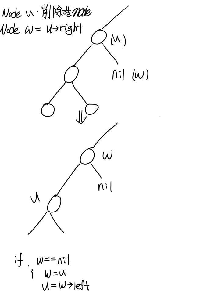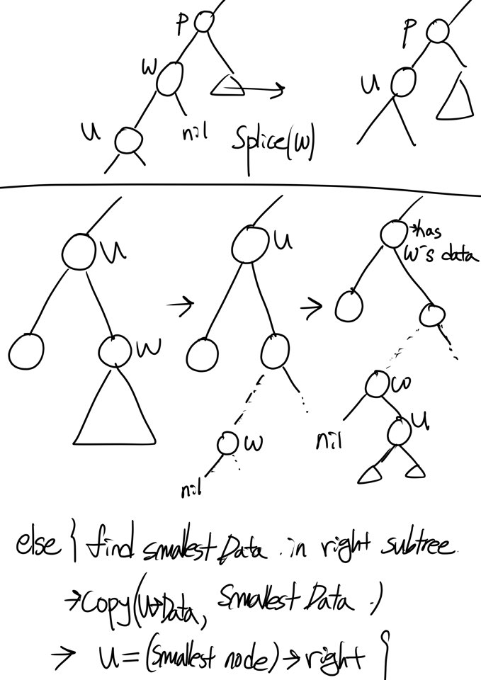 삭제할 정보를 갖고 있는 Node는 u였습니다. 여기서 u의 right child를 w로 잡고 w가 nil인 경우엔 삭제할 node를 w로 가리키고 삭제할 node의 right child를 u로 가리키게 만듭니다. 하지만 삭제할 node u의 right child가 어떤 Subtree를 가지고 있다면 Right subtree에서 가장 작은 Node의 Data를 삭제할 Data를 가진 Node u의 Data로 옮겨주고 삭제할 node를 잡고 있던 node u를 가장 작은 node의 right child를 가리키게 만듭니다. 이로써, 두 번째 If statement는 if와 else이후 같은 상태의 node w, u의 모습을 갖추게 됩니다.