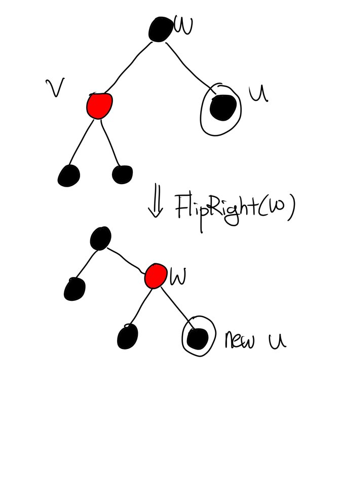 이 경우엔 u에 대해 FlipRight를 수행합니다. 그러나 위의 표에서 보는 것처럼 u의 double black 성질은 사라지지 않았습니다. new u로 표현한 까닭은 Case 1을 한 번 처리하고 난 u는 초기에 parameter로 받은 u가 아니기 때문입니다. 사실 Case 1은 Case 3로 곧장 이어지는데 이는 나중에 다시 다루기로 합니다. 아직 double black node인 u를 return 했기 때문에 RemoveFixUp의 while문을 빠져나오지 못하고 double black node u에 대한 검증은 Case에 따라서 계속 됩니다. 여기서 대충 각 Case가 Return하는 Node가 Iterator처럼 작동한다는 사실을 알 수 있습니다.