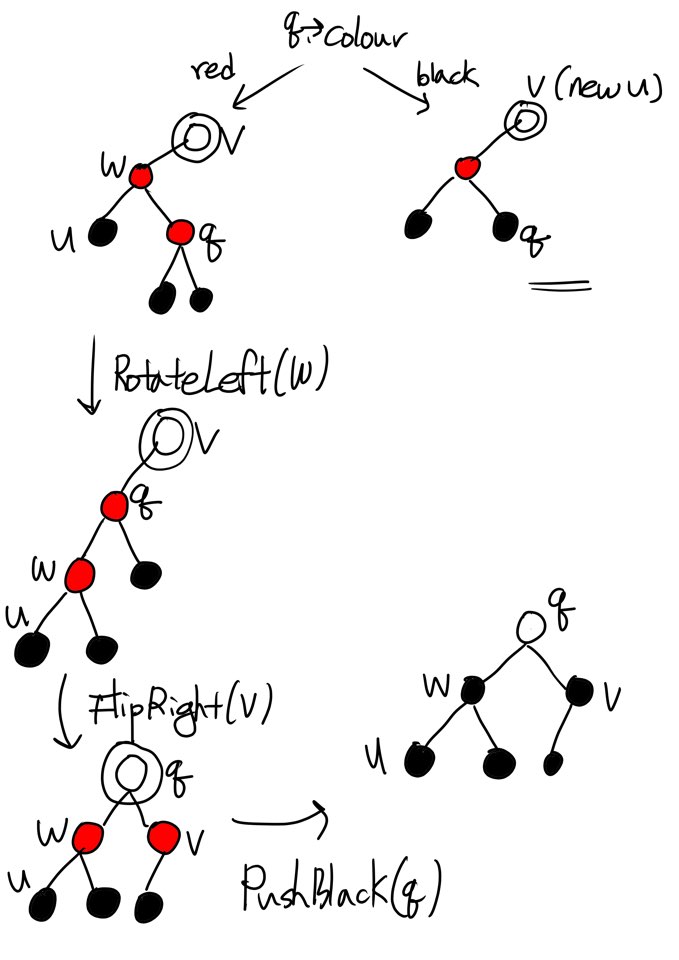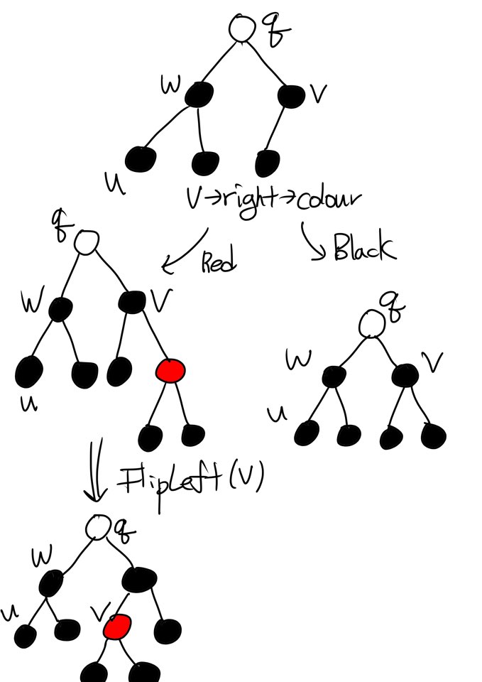 Node 외부에 둘러친 검은 원은 Colour에 +1을 주는 것이다. 따라서 Black node가 추가로 원형 띠를 두르고 있다면 Double Black을 나타낸다. 만일, q가 Red라면 Case 2의 단계와 좌우대칭인 모습이 나타나고 그 방법을 대칭인 채로 처리하면 됩니다. 오히려 Case 3가 Case 2보다 간단한데 그것은 Case 2가 v에 대해 Left-Leaning을 검증했었지만 Case 3는 그럴 필요가 없기 때문입니다.