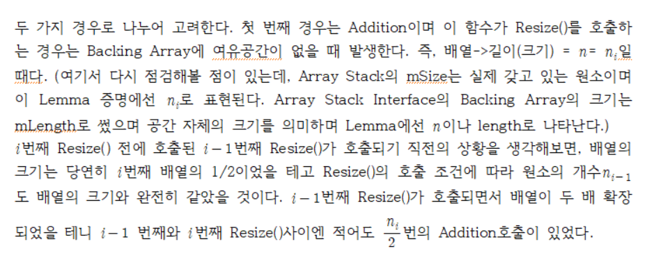 전의 Running time을 계산할 땐 이 Resize()를 무시했다. 여기서는 Amortised analysis기법을 사용하여 분석해보기로 한다. 이것을 통해서 Add/Remove가 각각 수행될 비용을 계산하려는 것이 아니고, m번의 Add/Remove를 호출할 때 필요한 모든 Resize()의 비용을 계산하려는 것이다. 다음 Lemma를 증명할 것이다. 작성하다보니 mSize와 n이 혼용되어 사용되었다.