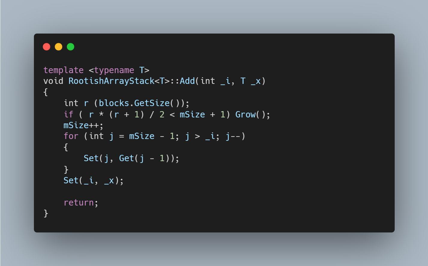 Grow()에서 소모하는 시간을 제외하면 Add의 Running time은 Array Stack처럼 원소들의 위치를 교환하는 작업에 압도적으로 의존하게 된다. 따라서 Array Stack과 같은 O(1 + n - i )의 Running time을 갖는다.