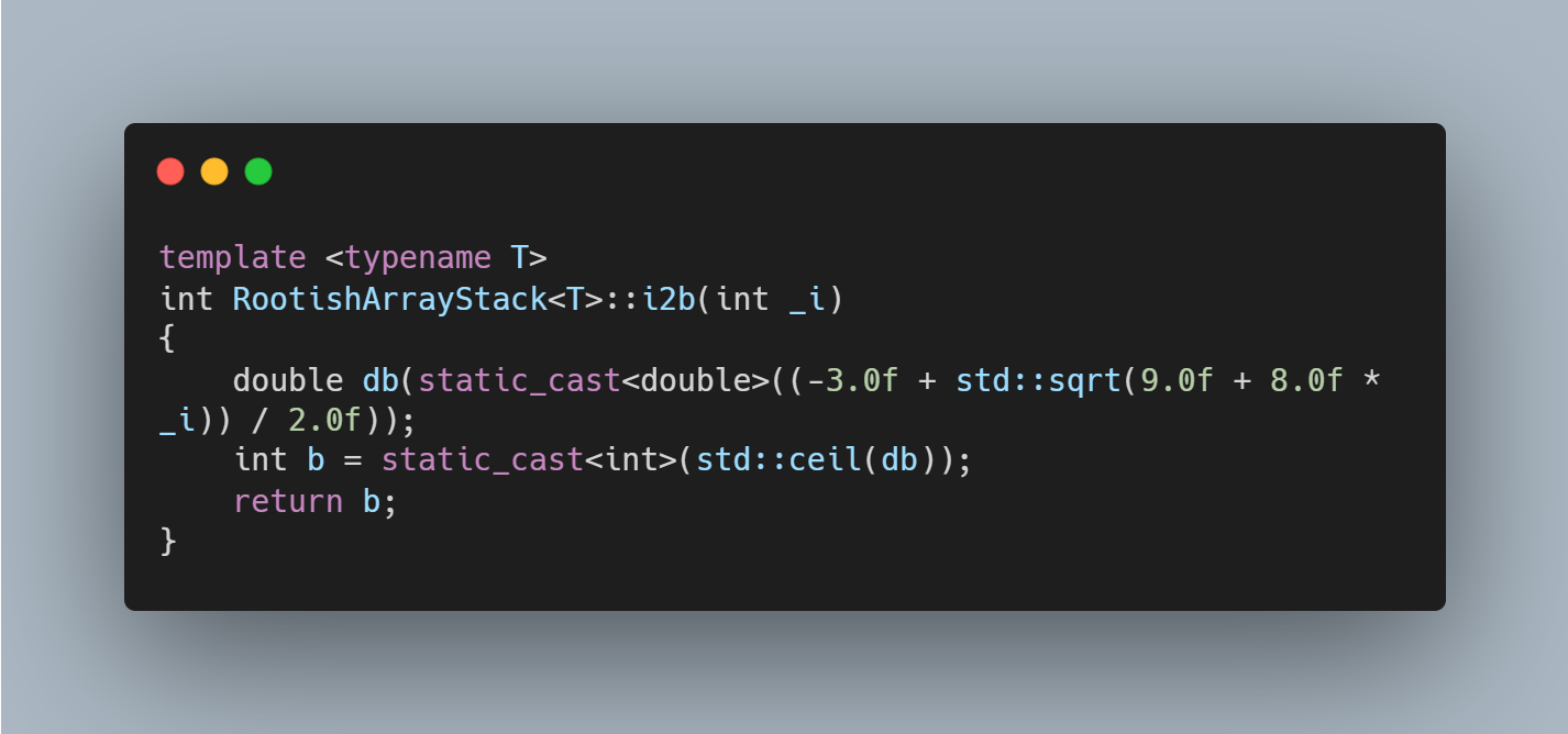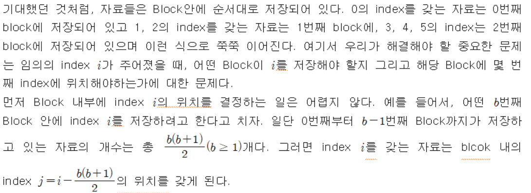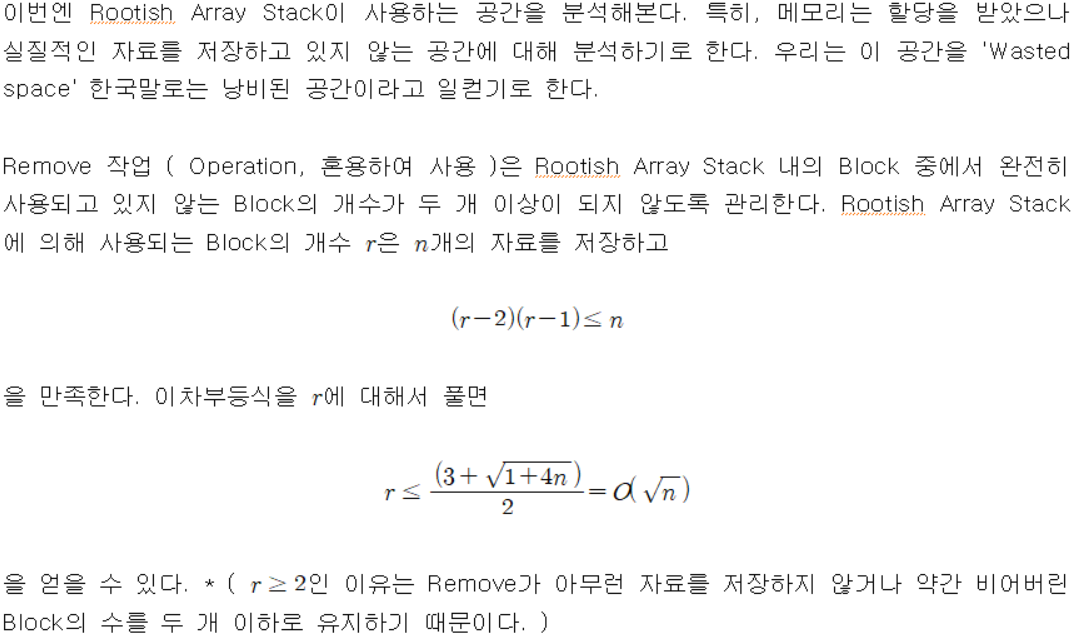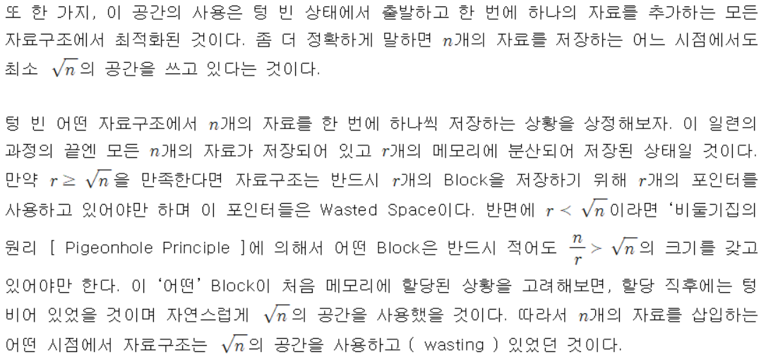 Grow()와 Shrink()의 호출 직후의 상황은 정갈하다고 표현할 수 있다. 마지막 Block은 아무것도 저장하고 있지 않을 것이며 그 이전 Block은 모든 배열에 자료를 저장하고 있는 상태일 것이다. 이 상태에서 더 자료를 추가하거나 한 Block을 비우기 전까지 Grow()나 Shrink()가 호출되는 일은 없다. 따라서 설령 이 두 함수의 Running time이 O(r)이라고 하더라도 Amortised running time을 생각하면 Amortised running time으로서는 O(1)이라고 할 수 있다.
