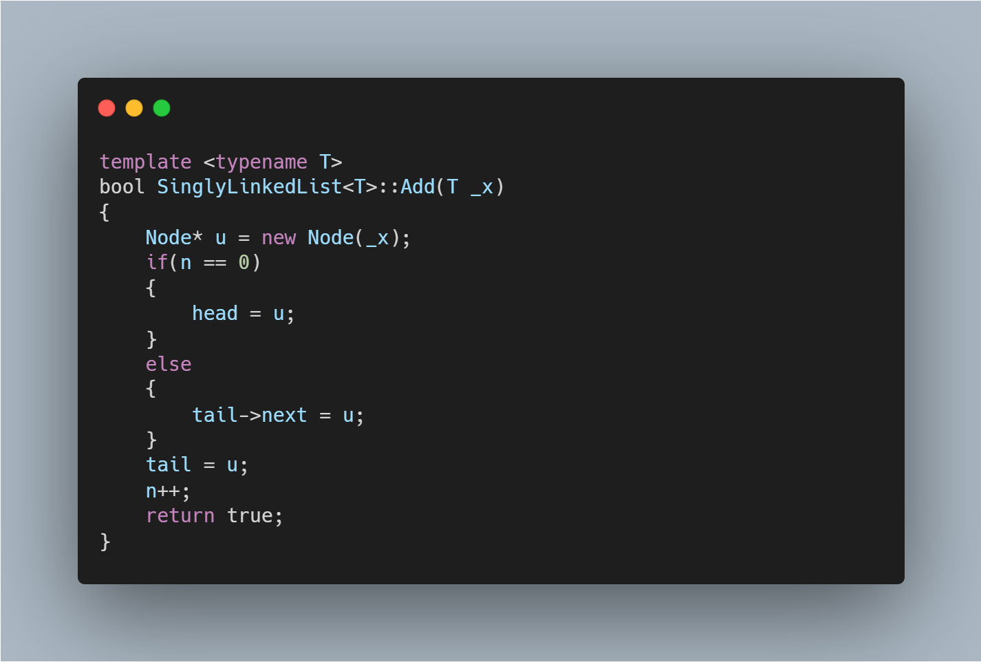 대부분의 경우에 Add는 tail->next에 새로운 node u를 연결하는 것으로 수행된다. 하지만 n=0인 특수한 경우(즉, head=tail=nulltpr)를 고려해야 하는데 이 경우에 Add를 수행하면 tail=head=u다.