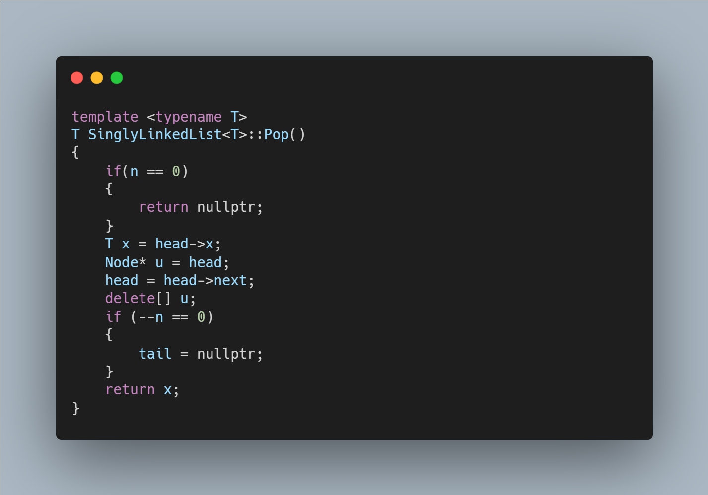 Sequence, 즉 Node를 이어붙인 어떤 구조의 크기가 0이 아니라는 것을 검증하고 나서 Head를 Head->next를 가리키게 만들고 n--을 수행한다. 주의해야할 점은 pop을 수행할 때 n이 1이면 tail을 nullptr로 이어주는 것이다.