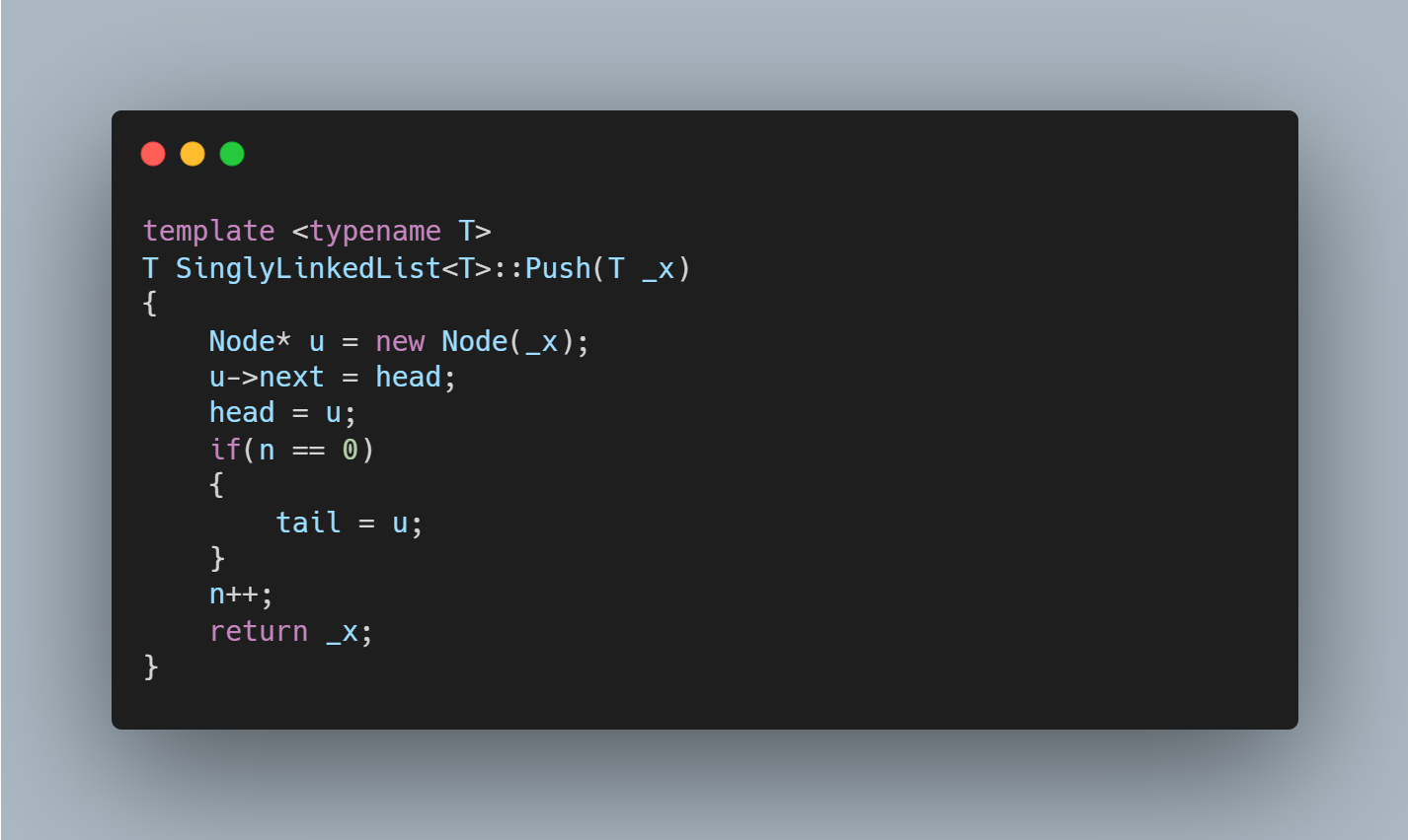 SLList는 Head부분에 자료의 추가와 삭제를 실현함으로써 Push()와 Pop()을 구현할 수 있다. Push는 간단하게 새롭게 추가할 Node u에 자료 x를 담고 u.next Pointer를 기존 Head에 이어주면 된다. node의 개수를 추적하는 n을 1추가해주는 것도 잊지 않는다.