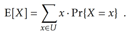 딱딱한 표현을 쓰자면 랜덤화 된 자료구조의 Running time은 Random Variable(랜덤 변수)이며 여기서는 그 랜덤 변수의 Expected value에 대한 공부를 하기로 한다. 셀 수 있는 집합 U 안에 있는 이산 랜덤 변수(Discrete Random Variable) X의 Expected Value(E[X], 기댓값이라고도 함)는 다음과 같은 공식으로 표현된다.