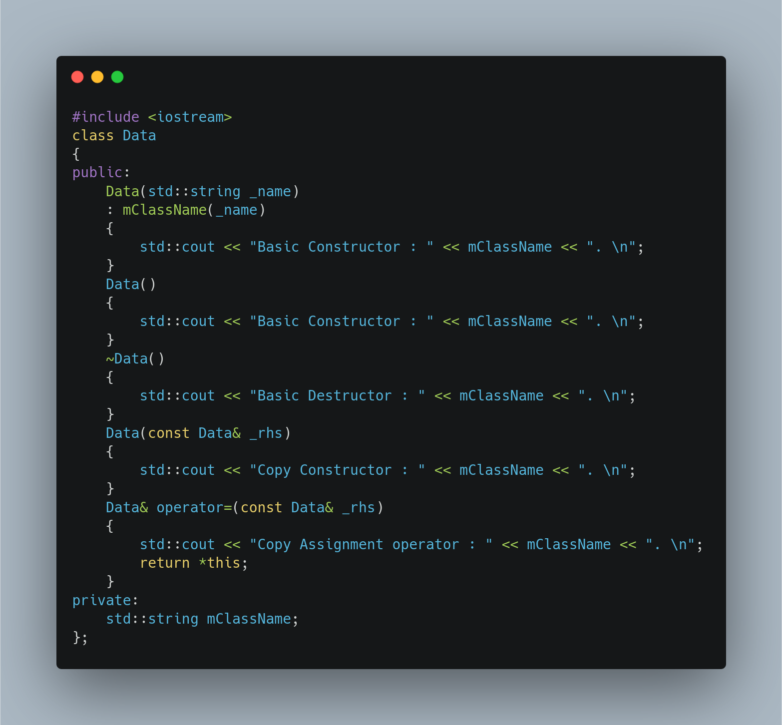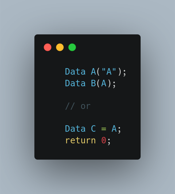 미묘한 차이가 있습니다. 다음과 같은 형태의 간단한 Class definition을 생각해봅니다. copy constructor는 different object로 같은 타입이면서 새로운 object를 initialise합니다. 반면에 Copy assignment operator는 같은 종류의 오브젝트를 다른 오브젝트에 복사할 때 사용합니다.