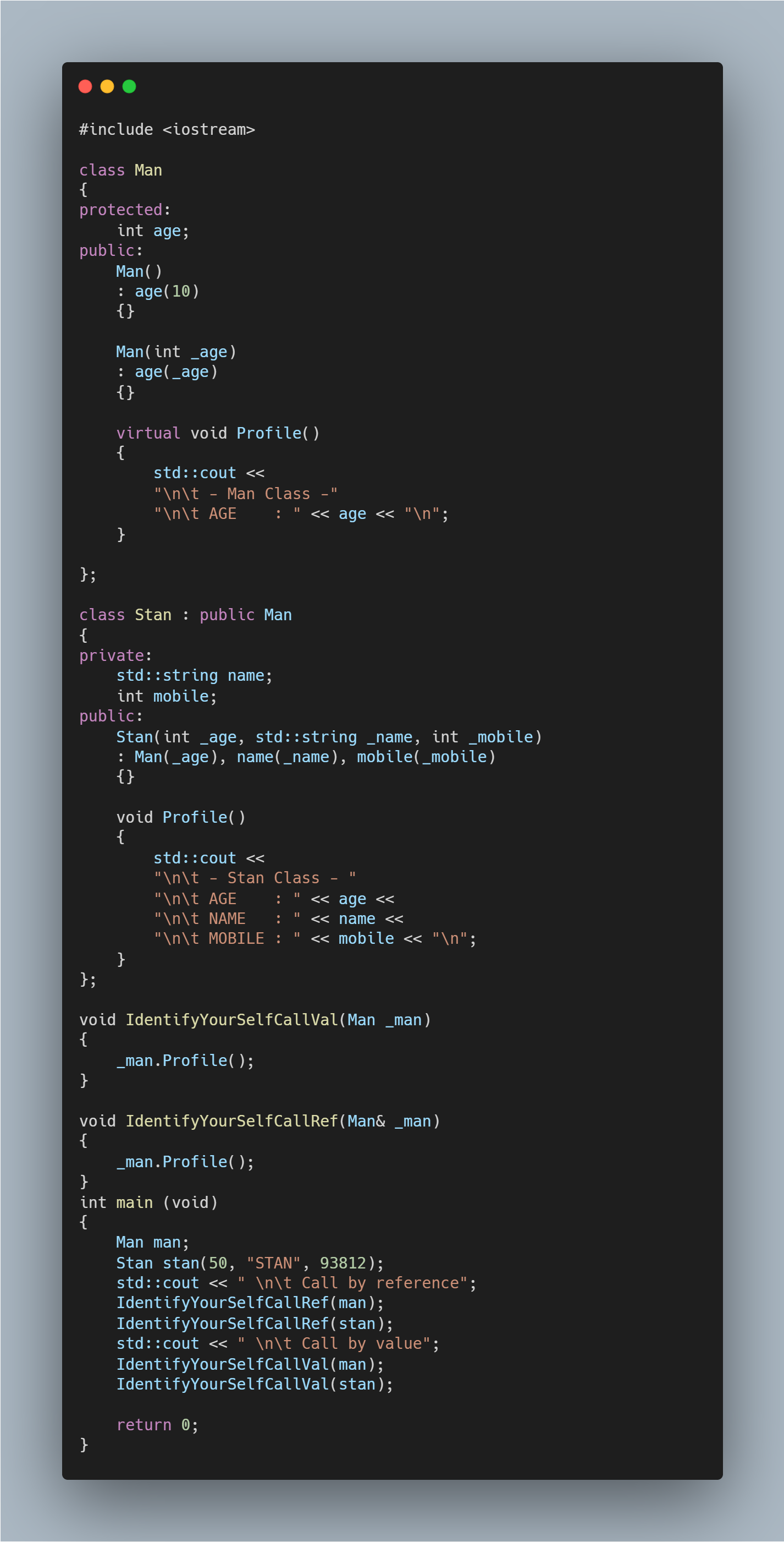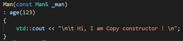 이제, Base class였던 Man으로 다시 돌아갑니다. 이 Base 클래스는 컴파일러가 슬쩍 달아주는 포인터가 있고 이 포인터는 Base클래스의 모든 가상함수들의 주소에 해당하는 가상함수테이블로 이어지고 있습니다. Call by value의 호출을 하면 argument로서 Base class의 reference가 아니라 복사생성자가 호출되면서 Man 부분 만큼 복사본이 올라갑니다. 완전히 똑같은 Man을 복사하면 vptr로 Stan에 접근할 수 있을 것 같습니다. 하지만 복사생성자가 Base 클래스인 Man의 가상함수테이블을 생성한다는 점이 문제입니다. 이렇게되면 vptr[Virtual Table Pointer]를 죽을 때까지 호출해도 Derived 클래스인 Stan의 멤버에 접근할 수가 없습니다. 따라서, Call by Value 호출 시, Man의 가상함수테이블이 생성된 것이고 이에 따라 Stan의 멤버들이 잘려버린 것입니다. 바로 이 부분을 Slicing이라고 일컫습니다. 정말 Copy constructor를 호출하는지 확인을 해봅니다.