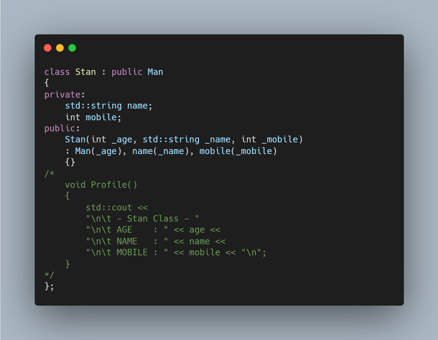 Base 클래스엔 vptr가 존재하며 이는 Base 클래스를 상속받는 모든 클래스에 상속되며 해당 클래스가 가상함수를 포함한다면 생성된 가상함수테이블을 가리키게 됩니다. 따라서 가상함수를 포함하는 모든 클래스는 가상함수테이블을 위한 포인터 만큼 크기가 더 큽니다. 여기서 Base인 Man에는 Profile()이라는 가상함수가 있었습니다. 그리고 Derived인 Stan 클래스엔 이 Profile()을 오버라이드[Override]한 함수가 있습니다. Man 클래스의 vptr은 Man 클래스를 위한 가상함수테이블을 가리키고 이 가상함수테이블에는 Man::Profile()을 가리키는 포인터가 있을 겁니다. 같은 식으로 Stan 클래스엔 Stan 클래스의 가상함수테이블을 가리키는 vptr이 있을 것이고 해당 가상함수테이블에는 Stan::Profile()을 가리키는 포인터가 존재합니다. 여기서 만약 Stan이 Man의 Profile()을 오버라이드하지 않았더라면 해당 가상함수테이블의 함수 포인터는 Stan이 아닌 Man의 Profile()을 가리킵니다. 즉, 가상함수테이블의 함수 포인터는 가장 깊이 상속된( Base에서 가장 멀리 떨어진 ) 클래스의 함수를 가리키도록 되어 있습니다.