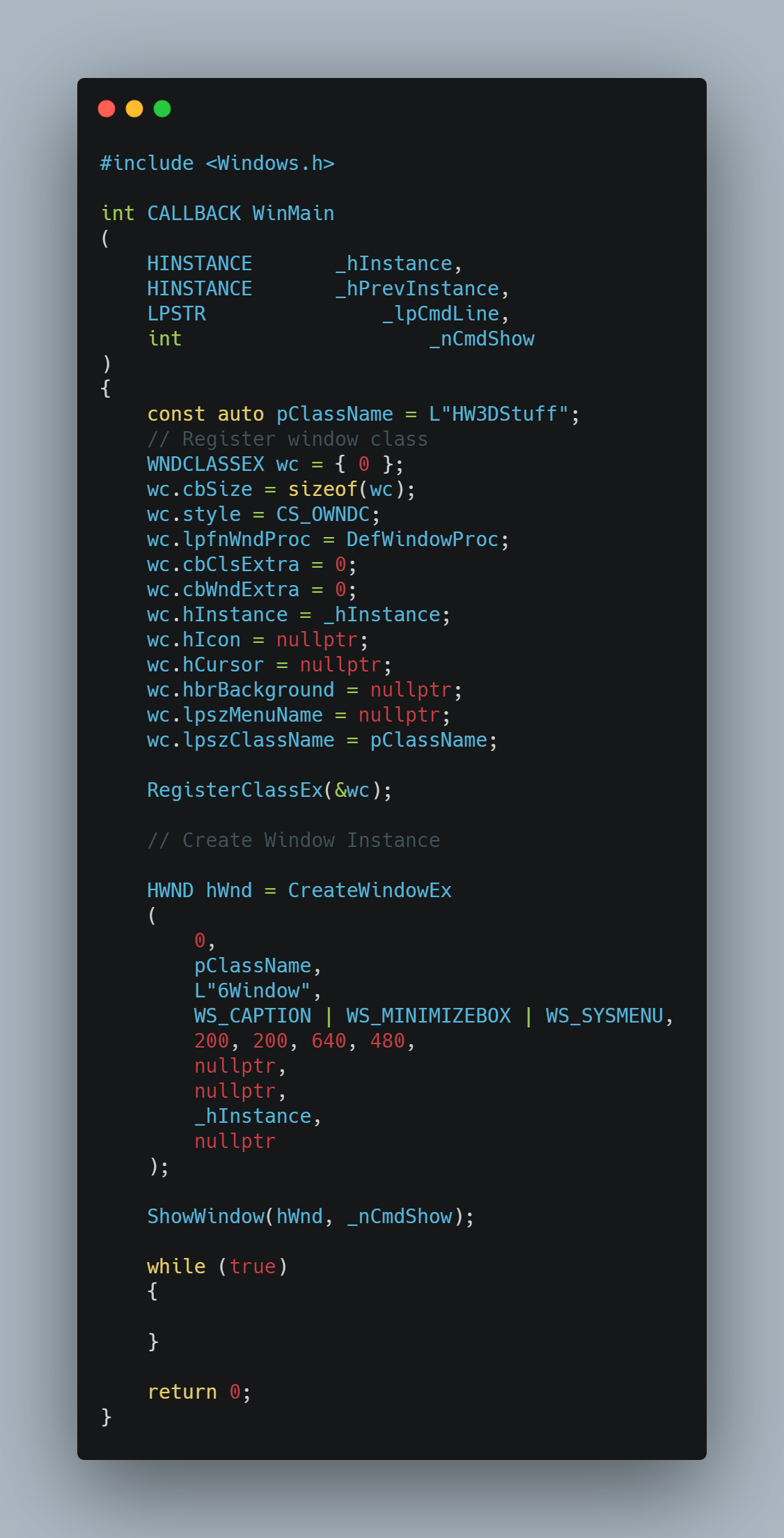 Console프로그램의 진입점이 int main(void) 인 것 처럼 Window로 출력하는 프로그램의 경우엔 CALLBACK WinMain이 Entry point가 됩니다. 가장 먼저 해야할 일은 Window Class를 하나 Register하고 Window Instance를 만드는 것입니다.