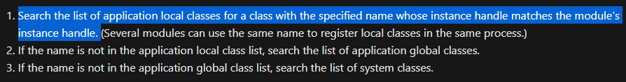 세 번째 Application Local Classes은 Procedure가 메인 윈도우를 위한 메시지나 입력을 처리할 때 사용합니다. 이건 우리가 윈도우를 닫아버리면 함께 해제된다고 하는데 UnregisterClass을 사용해서 메모리를 반환 하는 것이 좋다고 명시되어 있습니다. 이 세 가지의 Window Class를 각각 관리하기 위해서 시스템은 이 세 가지의 Window Class 구조체가 격납된 이루어진 리스트를 갖고 있습니다. 만약 다음과 같이 Window class을 만들어서 등록한다면, 시스템은 Window Class의 종류에 따라 알맞은 위치에 Window Class Name을 격납을 할 것입니다.
