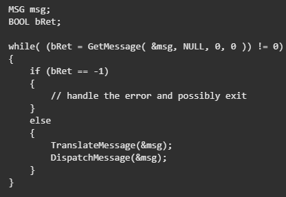 이 Message Loop는 기본적으로 세 가지 함수의 구성으로 이루어져 있습니다. GetMessage, TranslateMessage, DispatchMessage. 그래서 예시를 들면 어떤 어플리케이션 하나가 자신의 Thread을 위한 Message Queue에서 입력이 있는지 없는지 확인하는 작업을 Message Loop로 구현하면 다음과 같습니다.