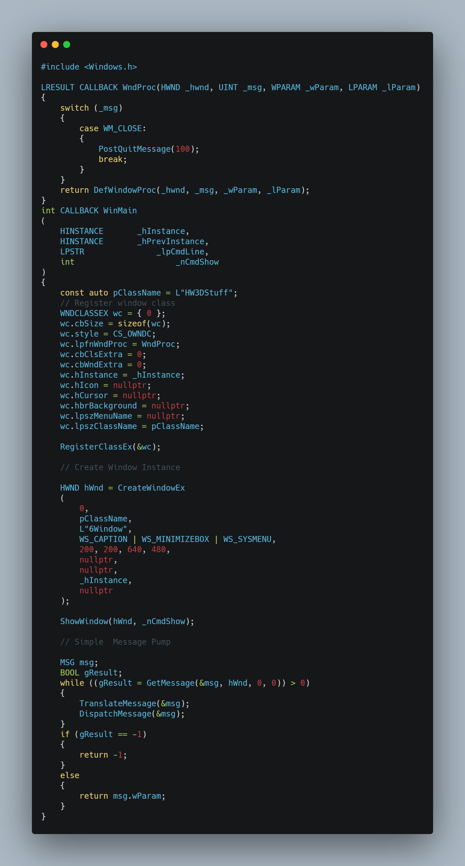 WndProc은 위에서 말했든 Default Window Procedure을 사용하되, 필요한 기능을 사용하기 위해 만들었습니다. 별 것 아니지만 Window를 닫을 때, 해당 값을 반환할 것입니다.