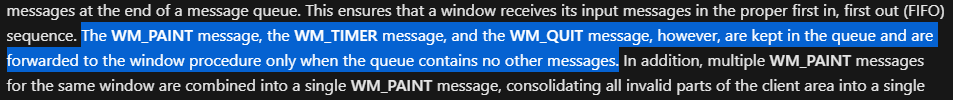 Queue이기 때문에 시스템은 당연히 Message Queue의 마지막으로 들어온 메시지를 가장 나중에 처리하지만 WM_PAINT, WM_QUIT, WM_TIMER는 예외라고 합니다. 예외되는 메시지들은 Queue에 어떠한 메시지도 남아있지 않을 때 비로소 Window에 전달된다고 합니다. (About Messages and Message Queues - Win32 apps | Microsoft Docs)