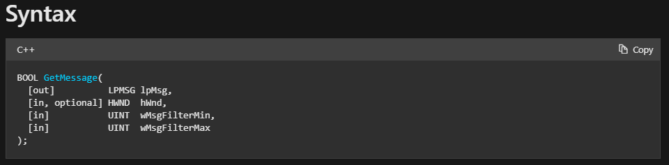 GetMessage의 argument을 보면 MSG Structure가 있습니다. 이 함수는 Queue에 있는 MSG을 복사해서 갖고 오는 역할을 하기도 합니다. 만약 두 번째 Argument NULL에 특정한 Window Handle을 명시하면 Queue에서 이 Window을 위한 메시지만을 추출해옵니다. 아래 사진을 보면 두 번째 Argument가 HWND임을 확인할 수 있습니다. 또한, 메시지를 필터링[Filtering]을 할 수도 있는데 이것은 논외이기 때문에 문서만 기록해 두겠습니다.