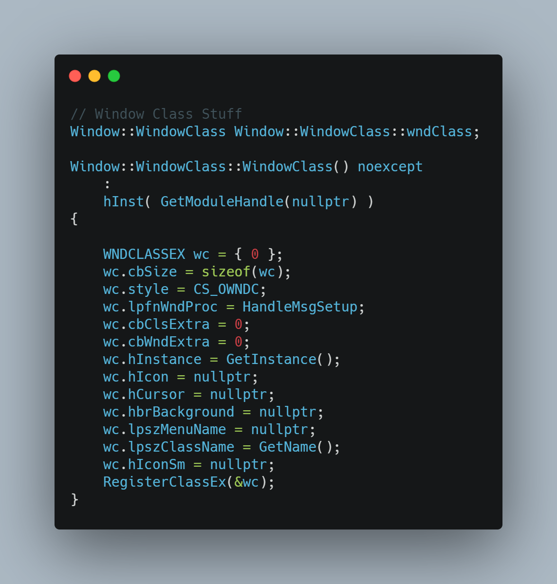 1. Window Class 안에 WindowClass라는 Class가 존재합니다. Window를 하나 만들 때, 우리는 Window Class가 필요했습니다. 그리고 해당 Class의 Name을 Window API Side에 등록할 필요가 있었습니다. 당연히 등록을 한다는 것은 프로그램을 제거할 때 해제해야 한다는 말을 함께 포함합니다. 그렇다면 Constructor에 API Side에 등록을 하도록 구현하고 Destructor에 UnresgiterClass()를 호출하도록 합니다. 안 해도 상관은 없지만 Symmetry를 생각한 프로그래밍이라면 해두면 좋을 것 같습니다. 실제로 깨끗하고 기분이 좋습니다.