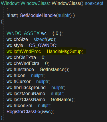 Window를 Register할 때 보면 HandleMsgSetup이라는 함수를 찾아볼 수 있습니다. 이 함수가 Window가 Initialising 될 때 대부분의 것들을 준비합니다.