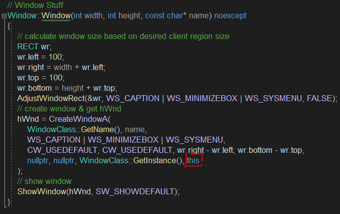 parameter로 Window의 width, height, class name을 받습니다. 그 외의 것들은 전에 했던 작업과 같지만 CreateWindowA의 마지막 Argument를 this를 넘겨줍니다. 또 달라진 점은 Window client area의 Width와 Height를 RECT이라는 구조체를 통해 정의했다는 점입니다.