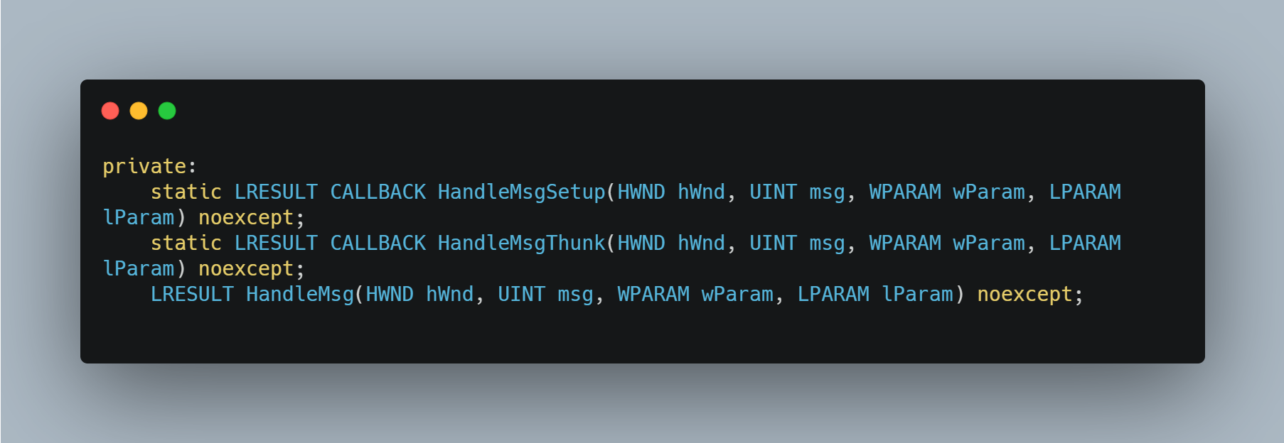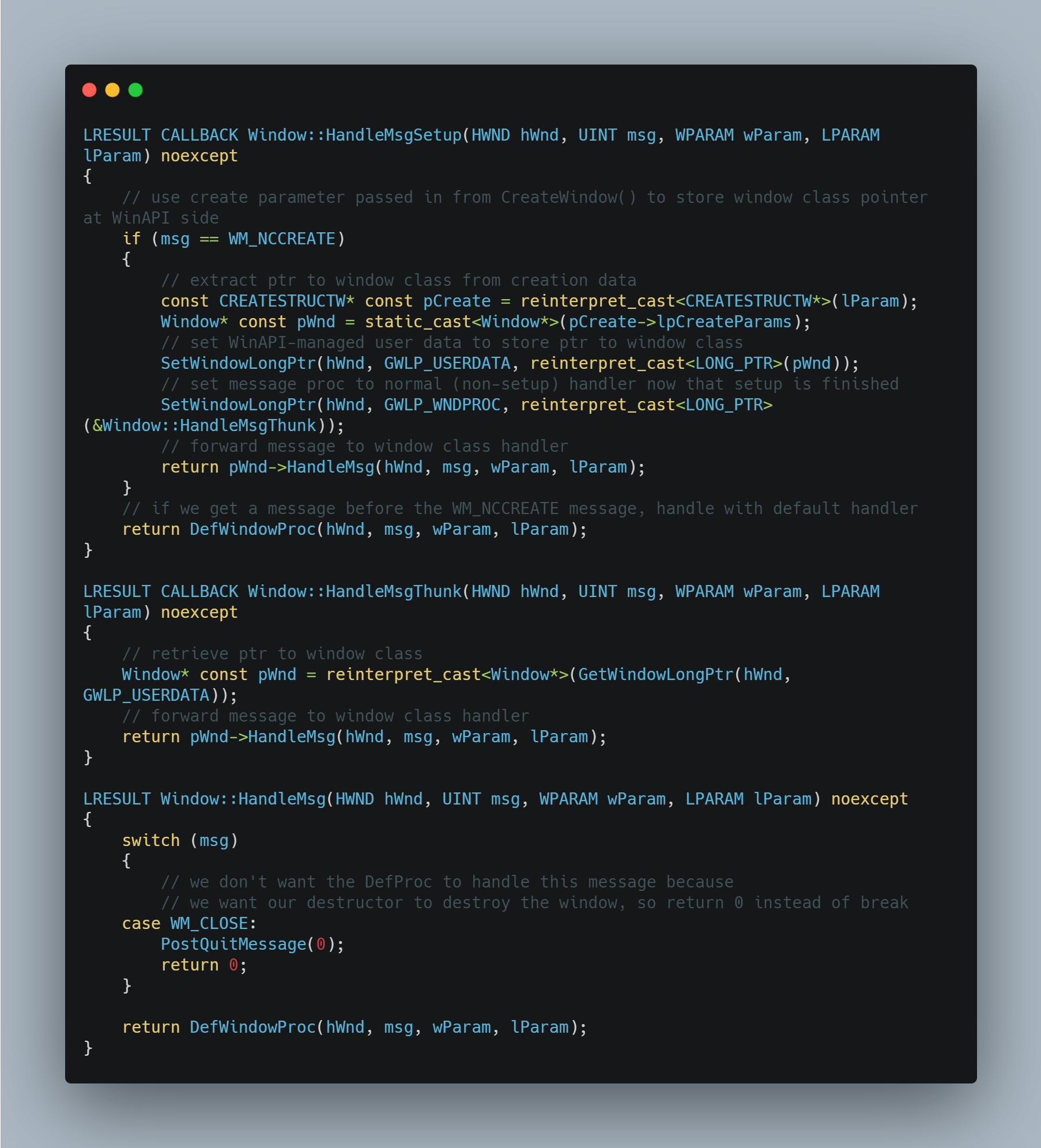 이렇게 되면 두 개의 Free Function에 대한 Explicit Pointer를 Win32 API side에 넘겨주며 생성된 Window의 Instance의 정보를 저장하고 Message Procedure을 정의한다는 것을 알 수 있습니다.