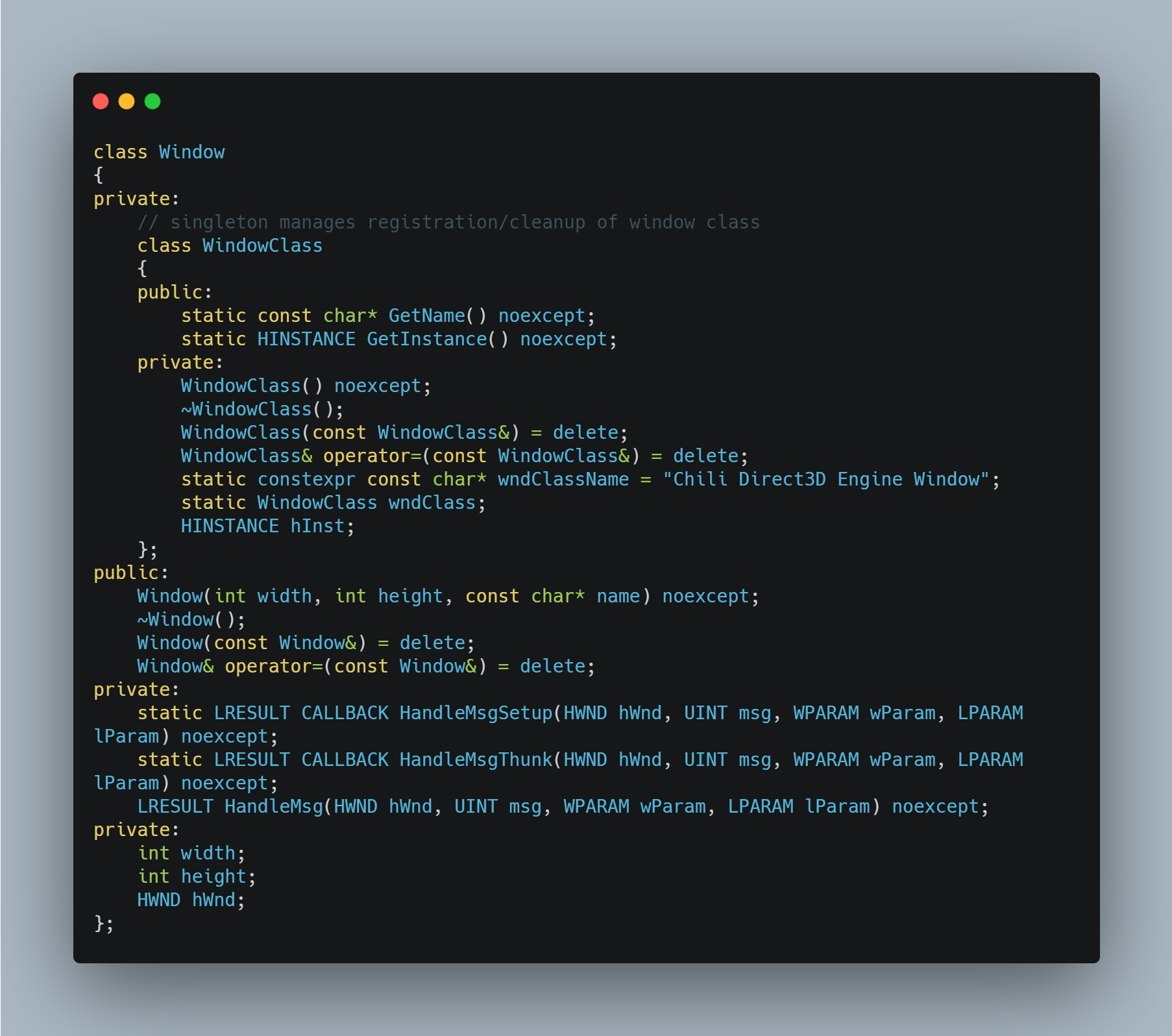 이런 식으로 잔뜩! 너무 많아서 긁어오기는 포기하기로 합니다 이제부터는 Encapsluation을 진행할 것입니다. 먼저 Design Pattern 중 Singleton을 이용할 예정입니다. Singleton은 잘 사용하지 않는다고 배웠으나 우리의 경우엔 Window가 유일하며 모든 Message를 처리하기 때문에 적합한 선택이라고 할 수 있습니다.