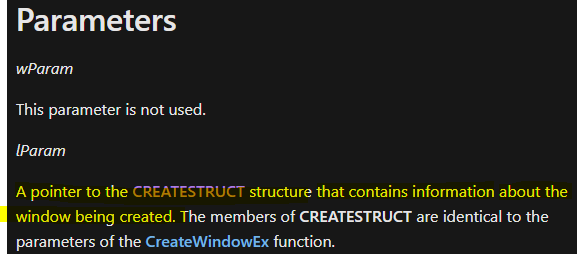 형광색 부분이 CreateWindowA로 넘겨준 this의 정체입니다 LPVOID lpCreateParams는 CreateWindowA의 마지막 Parameter로 넘겨준 this입니다. 즉, Window의 Instance의 Pointer와 Windows API Message Mechanism을 잇는 방법 중 하나 입니다. 어렵습니다. 코드를 읽어보면 lparam을 CREATESTRUCT로 reinterpret_cast하는 모습을 볼 수 있습니다. CREATESTRUCT는 위에 사진처럼 lpCreateParams를 Member로 가지고 이 member가 window의 instance의 정보를 갖고 있다고 했으니 window*로 다시 cast해주는 모습까지 확인할 수 있습니다.