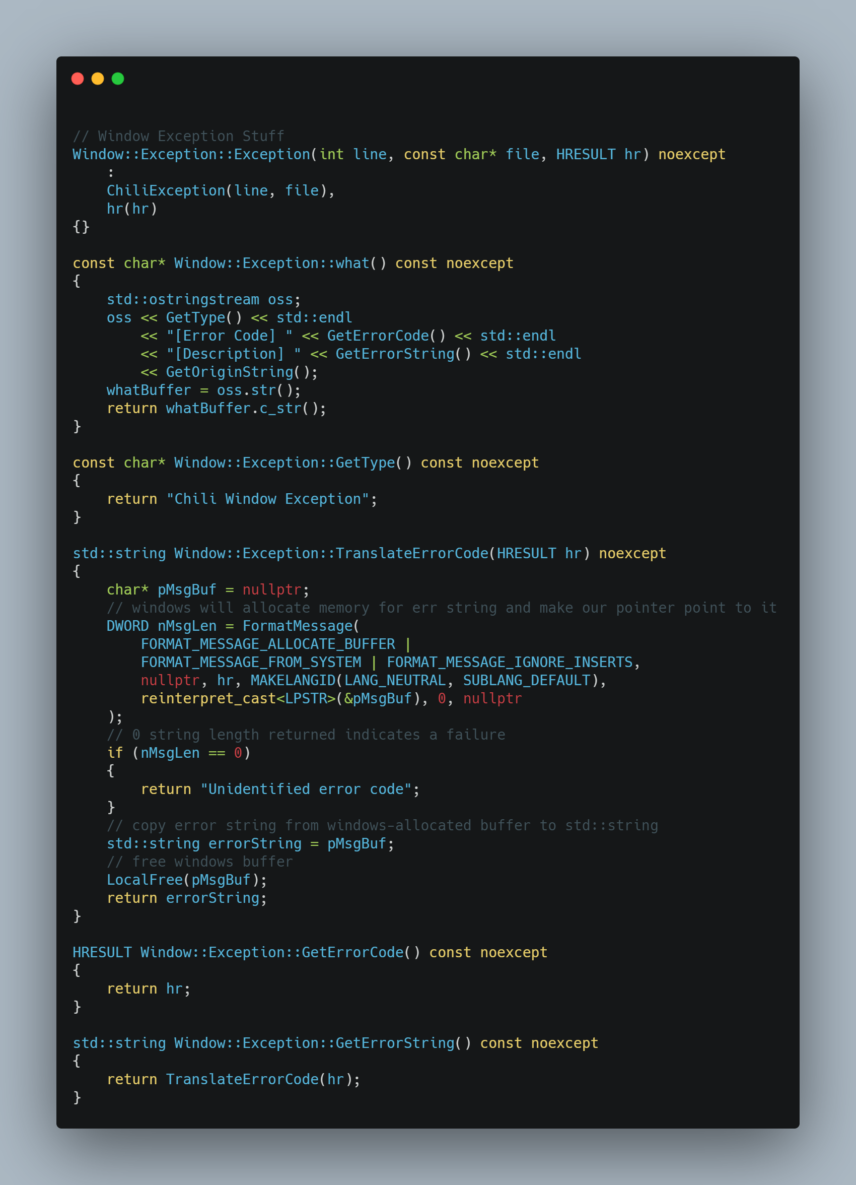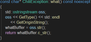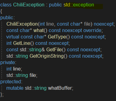 기본적으로 모든 것들을 std::exception에서 상속을 받습니다 이 ChiliException은 기본적으로 두 가지의 정보를 탈취합니다. exception이 발생한 장소의 line number 및 file을 what()이라는 함수로 인쇄할 것입니다.