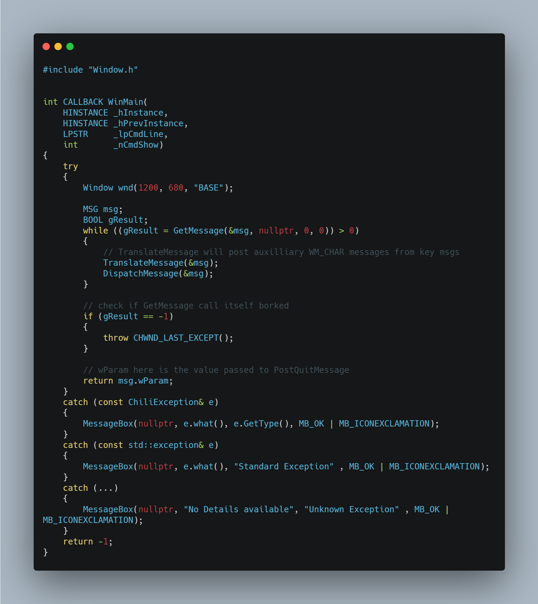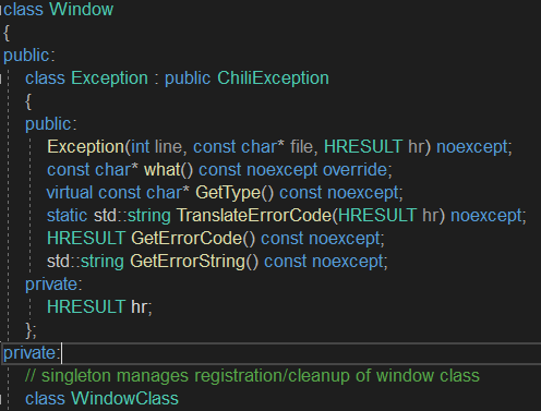 기존의 Window Class에 Exception Class를 추가했습니다 Constructor를 확인해보면 line과 file그리고 HRESULT hr을 받는다는 사실을 확인할 수 있습니다. line과 file은 Exception class를 정의할 때 무슨 의미인지 알게 되었습니다. 그러나 hr은 무엇일까요? 모르겠습니다. 그냥 Window의 Error Code들은 HRESULT라는 값을 참조한다고 합니다.HRESULT Error Codes | Inside Show | Channel 9 (msdn.com)이 Channel 9은 재미없어 보이긴 하는데 의외로 도움이 많이 되기도 합니다.