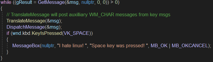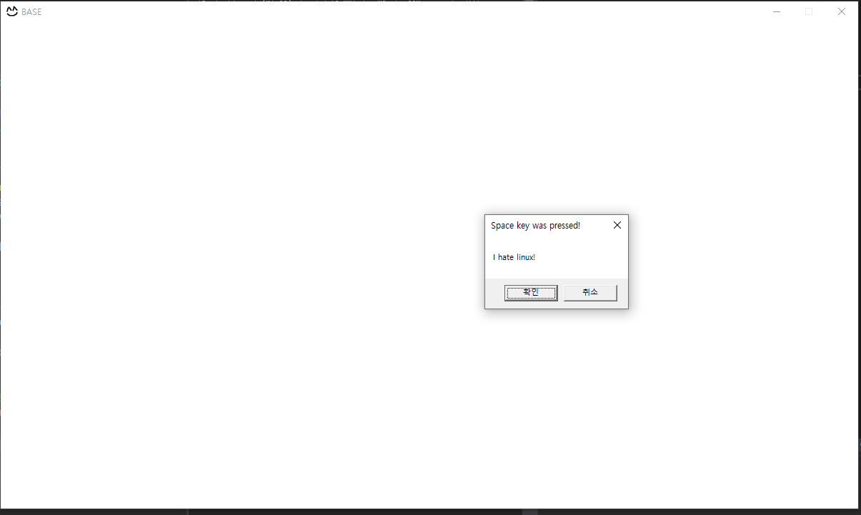 그리고 Message Pump part에서 Space key를 눌렀을 때, Message Box를 생성하도록 합니다. Debug를하면 다음과 같은 화면이 나오고 space를 누르면 Message Box가 나타납니다.