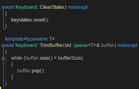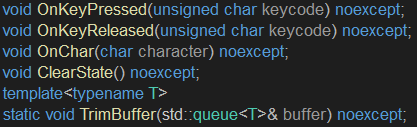 Window가 사용할 Private member functions OnKeyPressed/OnKeyReleased 두 함수 모두 Keystates와 Keybuffer를 Update합니다. 조립은 해체의 역순이고 해체는 조립의 역순인 것처럼 OnKeyPressed - OnKeyReleased는 서로 반대의 일을 할 것입니다. 맞는 비유인가? 아니면 말도록 합시다.