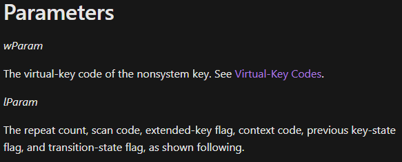 자주 봅니다 wParam은 지금까지 보았던 것처럼 key code의 정보가 있었습니다. 그렇다면 lParam에는 뭐가 있었던 것일까요? 바로 반복에 대한 내용이 포함되어 있었습니다.