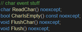 ReadChar 함수는 KeyIsPressed함수와 유사하게 Character를 읽어오는 함수인데 Event를 반환하는 함수가 존재하지 않습니다. 이유는 Character는 Text input을 위해 사용하고 Character의 Stream이기 때문입니다. 그러니 구태여 Event까지 다룰 필요 없이 그냥 Queue에 있는 Character를 빼오기만 하면 됩니다. 그 외 함수들은 모두 직관적이라 큰 어려움은 없고 Flush함수는 Key와 char을 모두 비우는 함수입니다.